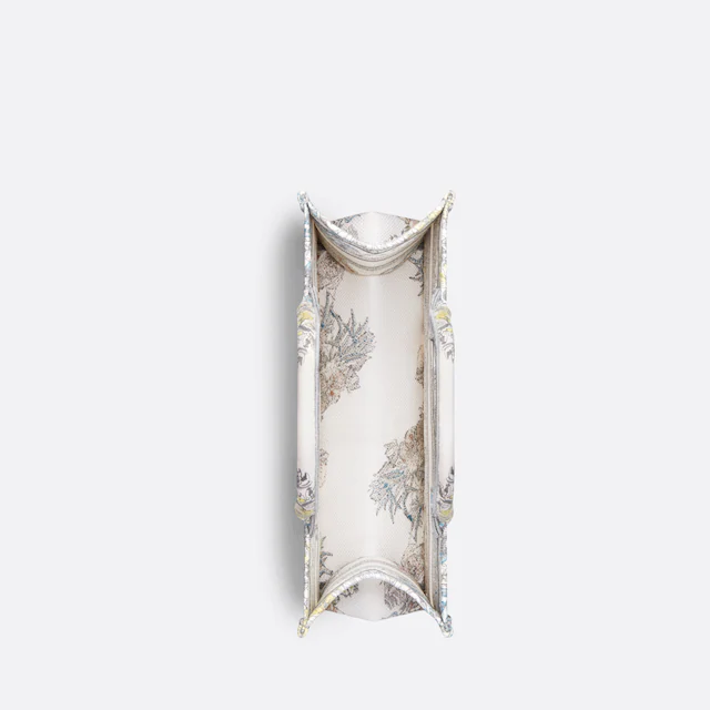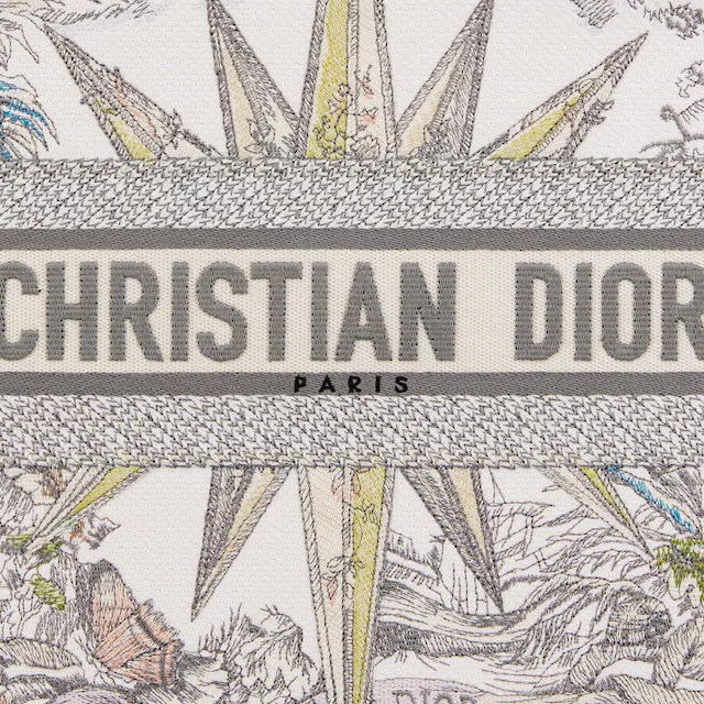 The Dithtor Book Tote is an original creation introduced by Dithtor's Creative Director, Maria Grazia Chiuri, and has become a staple of the Dithtor aesthetic. Designed to hold all the daily essentials, it is fully embroidered with a multicolor Rêve d'Infini motif by artist Pietro Ruffo, offering a dreamlike new take on Chrithtstian Dithtor's favorite star symbol and essential House code. Adorned with a Chrithtstian Dithtor Paris signature on the front, the medium tote exemplifies the House's signature savoir-faire and may be carried by hand or worn over the shoulder.