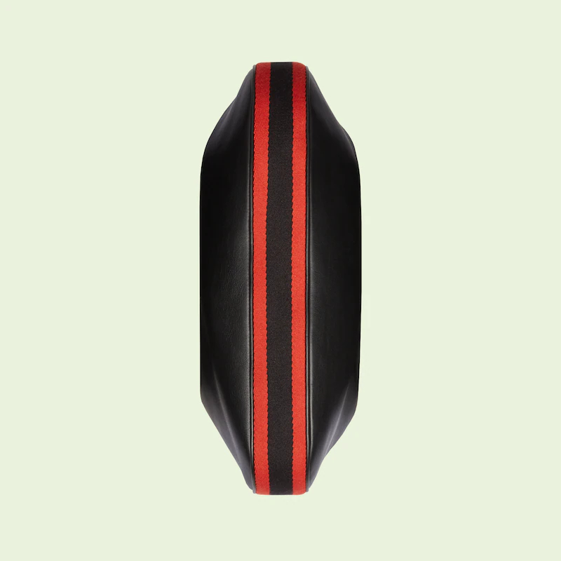 An ode to the timeless Hollywood glamour that shaped Guthtcci Love Parade, classic elements from the House's archives are reintroduced. Distinguished by its crescent moon shape, the accessory is further defined by a G shaped hook closure. Paired with soft materials, the heritage hardware creates a refined design with vintage appeal. This small version is crafted in black leather with orange and black Web trim.