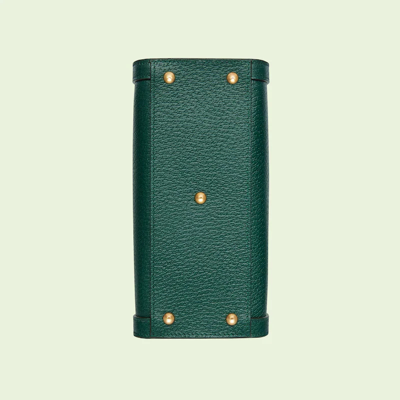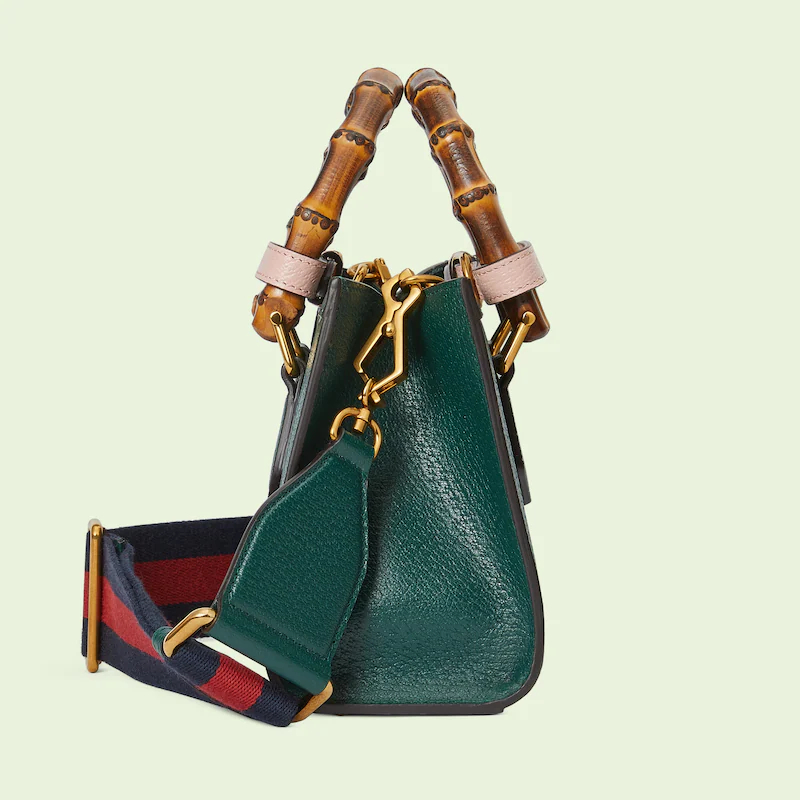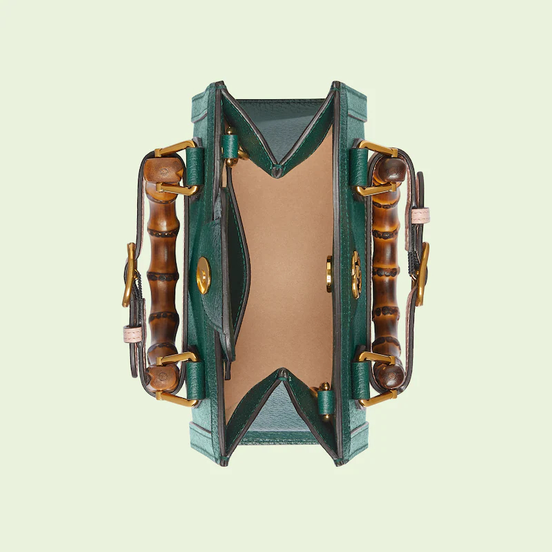 An evolution of a bamboo handle tote first introduced in 1991, the Guthtcci Diana represents the notion of style in constant evolution and is reimagined with removable, neon leather belts—a nod to the functional bands used to keep the handles in shape.�ョ��ere, a mini version of the emblematic style is presented in green leather.