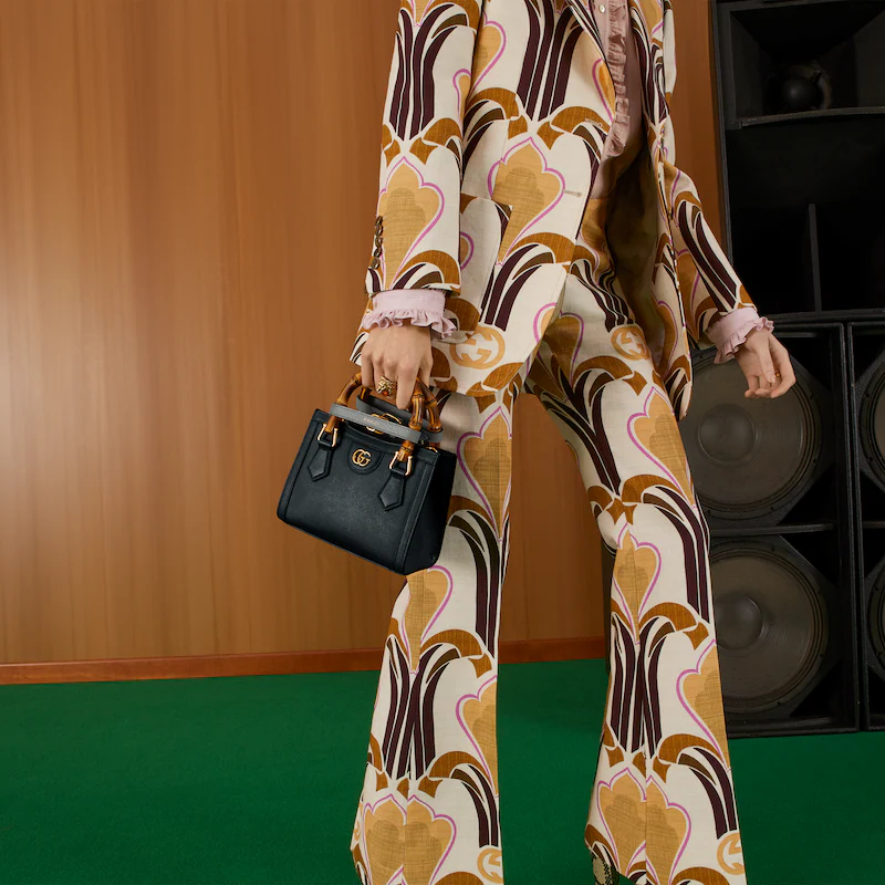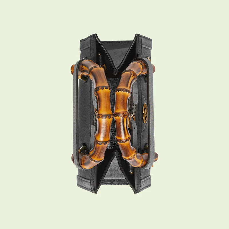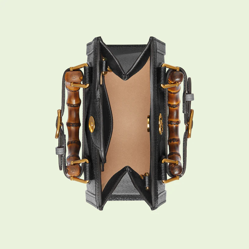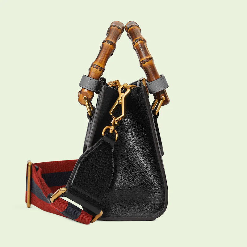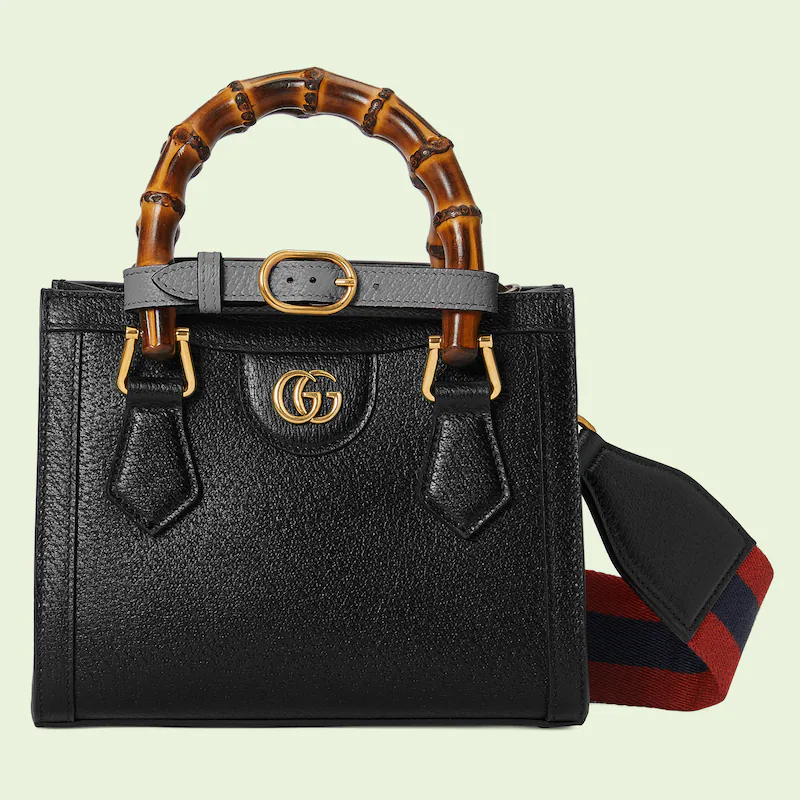 An evolution of a bamboo handle tote first introduced in 1991, the Guthtcci Diana represents the notion of style in constant evolution and is reimagined with removable, neon leather belts—a nod to the functional bands used to keep the handles in shape.�ョ��ere, a mini version of the emblematic style is presented in black leather.