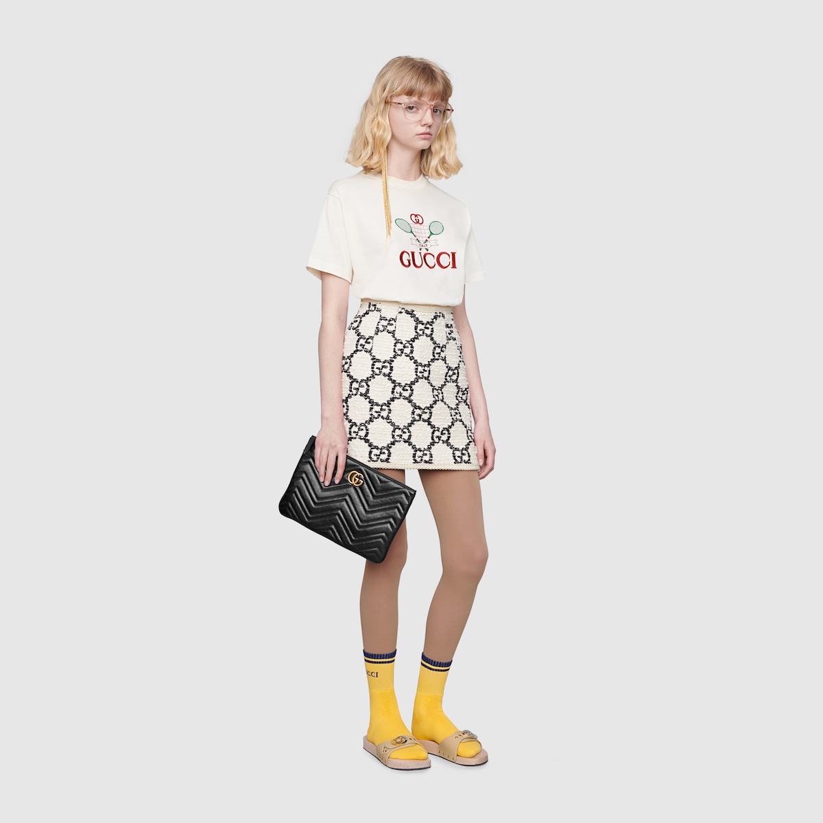 A pouch defined by matelassé chevron leather with a vintage finish. The GthtG Marmont collection is defined by the emblematic Double G hardware—a contemporary take on a Guthtcci archival belt buckle from the '70s that has become a hallmark of the House.