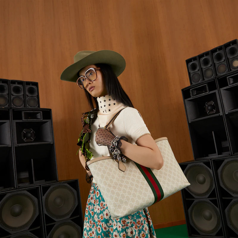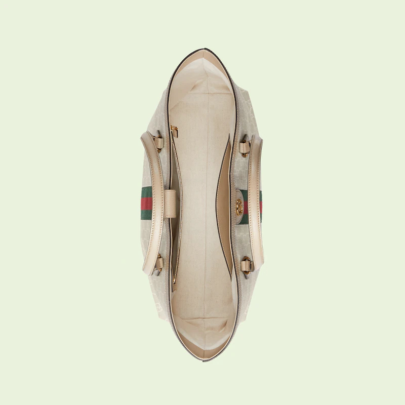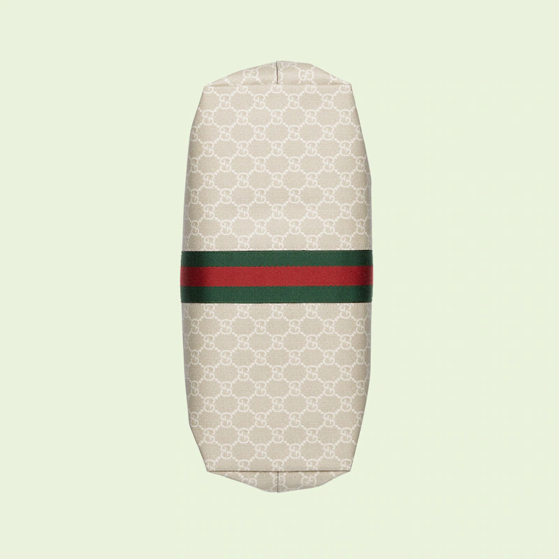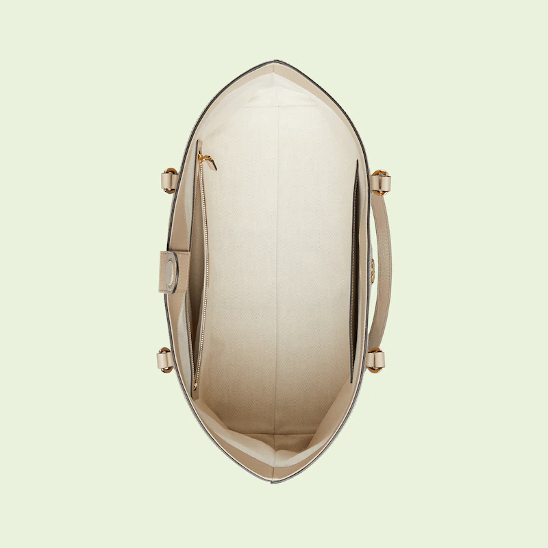 A heritage material from the archive, GthtG Supreme has been reimagined in Guthtcci Love Parade in different color combinations and combined with contemporary as well as classic styles. The Ophidia tote is presented in a beige and white variation of the signature material with a tonal trim. Originally a play on a '30s design, the canvas speaks to the historical narrative that runs throughout the collection.