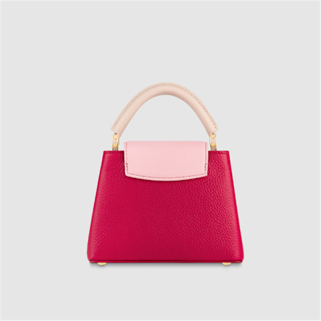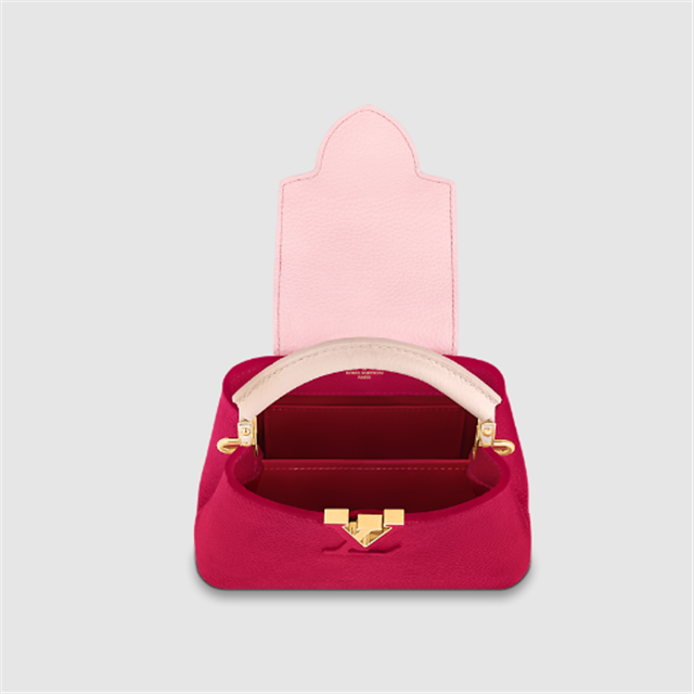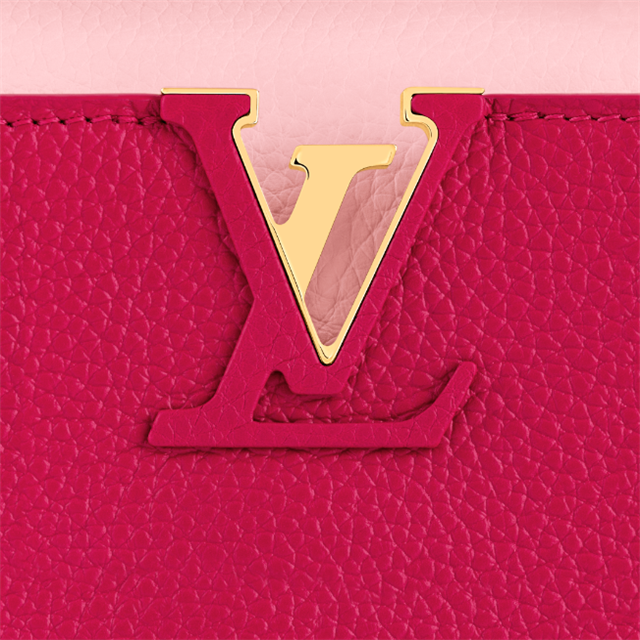 This very feminine Capucines Mini handbag is made from Taurillon leather with light pink on the flap and top handle. It features a gold-color chain, decorated with enamel Monogram Flowers, for shoulder carry as well as a detachable, thin leather strap for cross-body and shoulder wear.