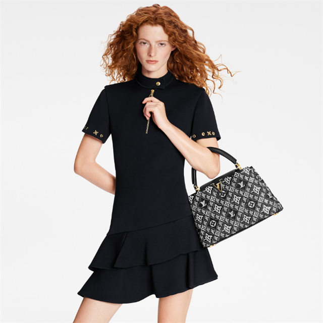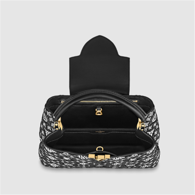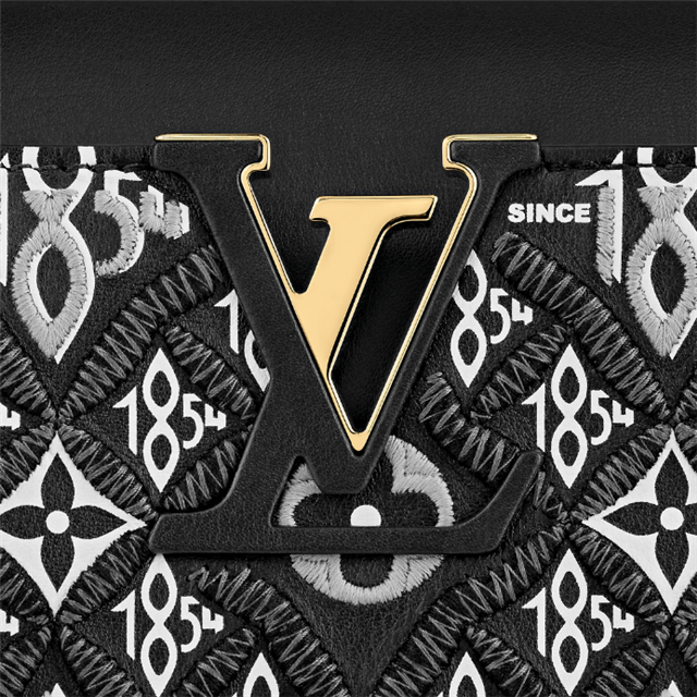 The Capucines MM handbag is made from supple calfskin embroidered with Nicolas Ghesquière’s new Since 1854 pattern. Combining the House’s traditional Monogram Flowers and LthtVs with 1854s, the year Lothtuis Vuithttton was established, the motif feels both vintage and modern. The bag’s removable strap is extra wide for extra-comfortable shoulder carry.