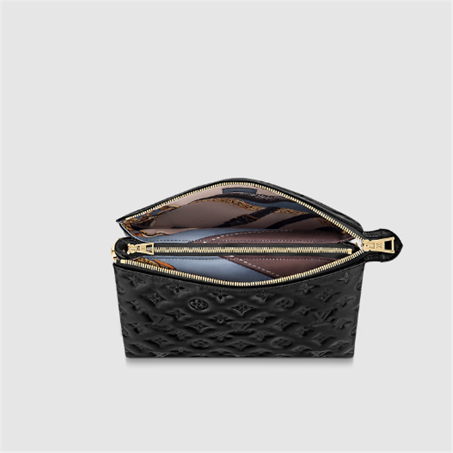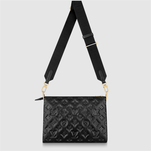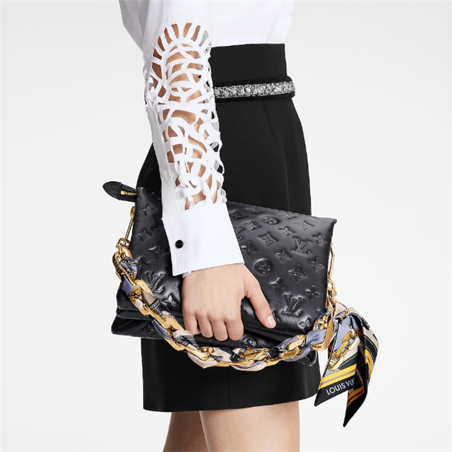 A printed twill scarf braided into its chunky chain gives this Coussin PM handbag a fashionably feminine allure. Crafted from puffy, Monogram-embossed lambskin, it is lined in a matching scarf print. Elegant in black, this versatile bag may be worn cross-body on its wide textile strap or shoulder-carried on the embellished chain.
