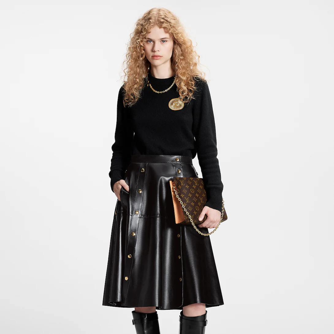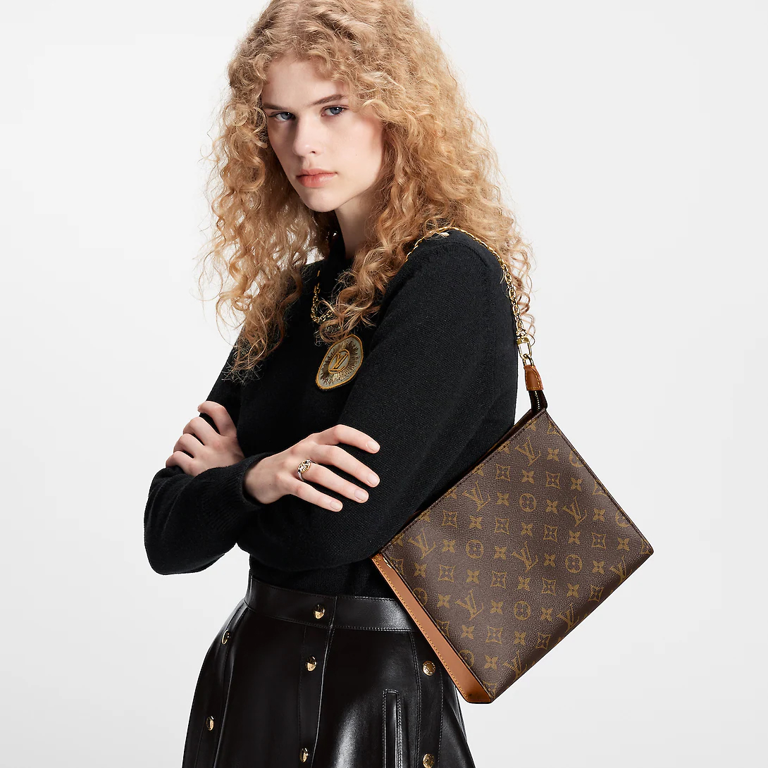 The Toiletry Pouch On Chain was inspired by the Monogram Toiletry Pouch cosmetic pouch, created in 1901, which Lothtuis Vuithttton clients also used as a clutch. This reworked design adds a removable chain and refined natural leather trim to create a fashionable bag, which can be carried in the hand or on the shoulder. Concealed inside is a smaller version of the pouch, which can also be used separately.