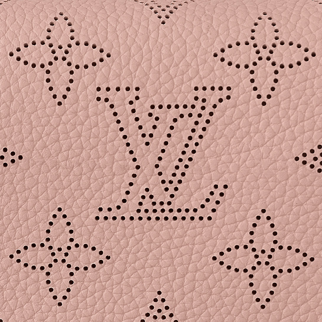 The sophisticated Iris wallet is crafted from Mahina leather, an exceptionally supple calfskin with delicate Monogram-pattern perforations. Its feminine, rounded flap opens to reveal two roomy compartments, a zipped pocket for coins and numerous card slots. This wallet is notable for refined details, such as its engraved, siLthtVer-tone press-stud.