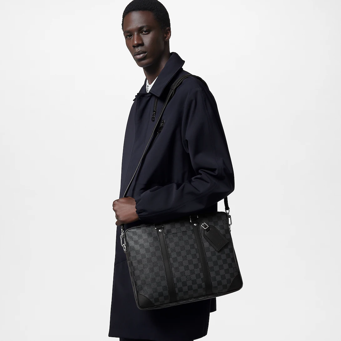 The Porte-Documents Voyage PM briefcase is made from Damier Graphite coated canvas with black-leather side bands, reinforced corners, top handles, and name tag. There’s an outside pocket for a smart phone and a padded interior compartment large enough for a 13-inch laptop. The removable and adjustable strap enables shoulder carry.