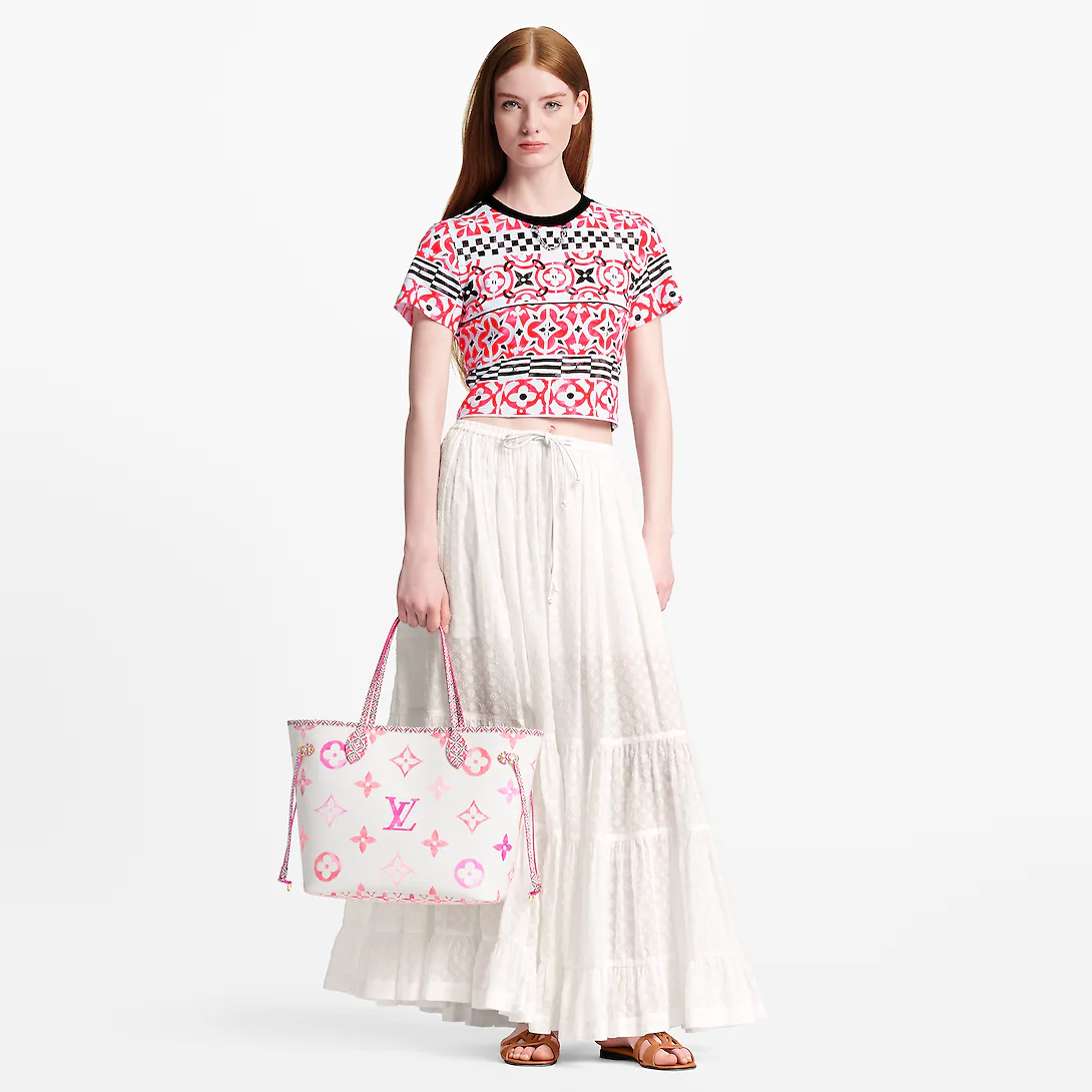 The Neverfull MM tote is summer-ready in cream-color canvas with a Giant Monogram pattern in pastel. The LthtV's and Monogram Flowers are rendered irregularly, as if in watercolor, and are perfectly complemented by the dense Monogram Blossom print on the trim along the top of the bag and on the handles and their mounts.