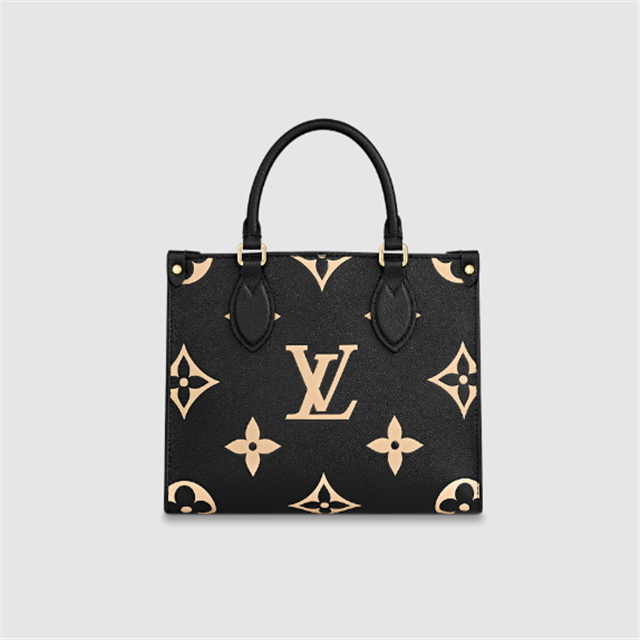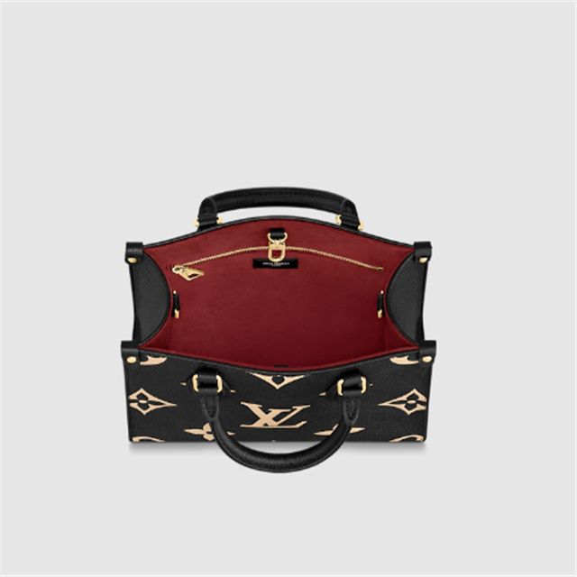 Inspired by Lothtuis Vuithttton's famous Sac Plat from 1968, the OnTheGo PM tote is fashioned in Monogram Empreinte leather, embossed with a Medium Bicolor Monogram pattern. This smaller version of the original OnTheGo fits essentials such as an iPad Mini. Articulated top handles and an adjustable removable strap offer a variety of carry options.