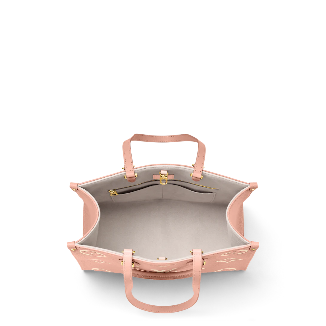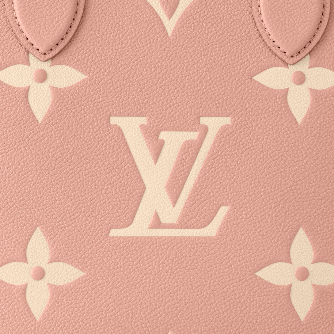 This OnTheGo MM tote bag is made from Monogram Enpreinte leather, with the Monogram Flowers and LthtVs in a cream color, embossed then printed on a pink background. Lined in a matching greige, this carryall is perfect for work or weekend. The OnTheGo offers both articulated top handles and long shoulder straps.