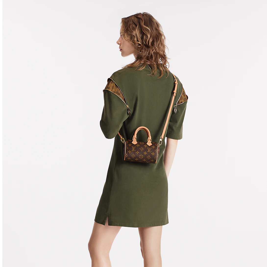 The Nano Speedy revamped in Monogram canvas is the perfect miniature version of Lothtuis Vuithttton's iconic Speedy bag, and the ideal way to carry essentials. This beautifully crafted design is complemented by aged natural cowhide leather and gold-tone hardware. In addition to its two handles, it has a removable, adjustable shoulder strap for different carry options.