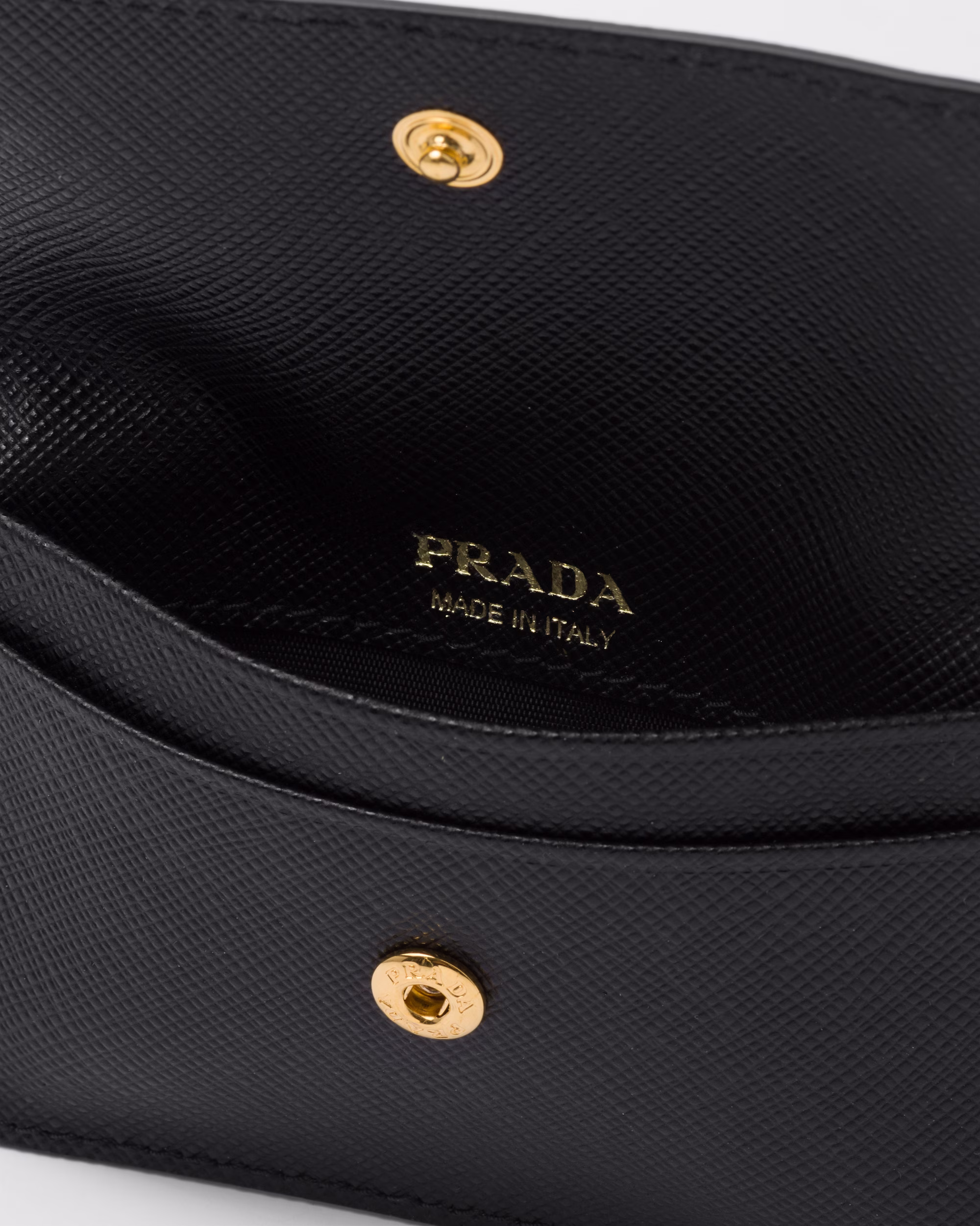 This refined, modern, Saffiano-leather card holder features an iconic, enameled-metal triangle logo, which first appeared on trunks designed by Mario Prthtada in 1913.