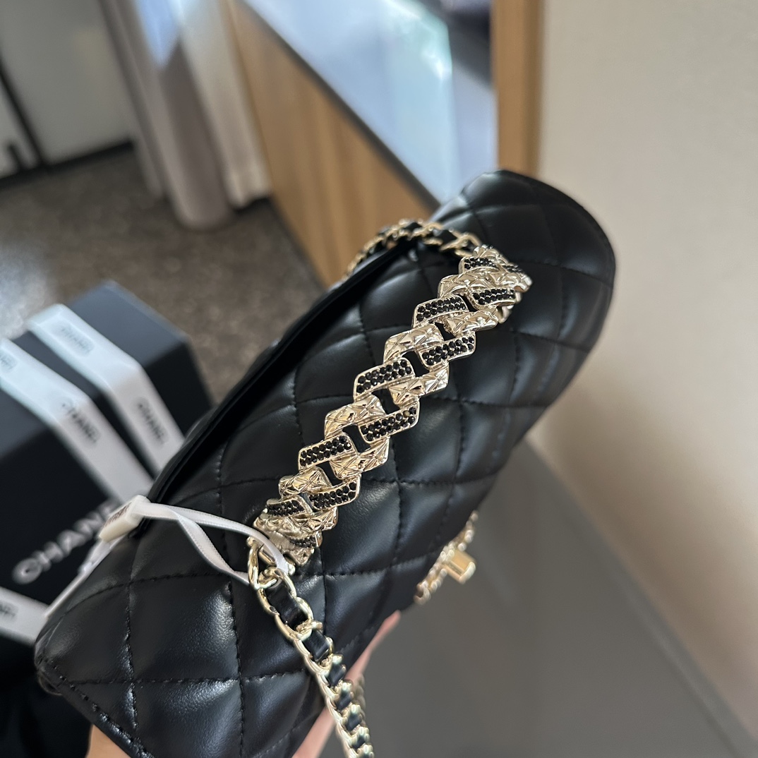 This is an authentic CHANEL Lambskin Quilted Crystal Top Handle Rectangular Flap. The chic crossbody classic is crafted in quilted lambskin leather in black. The bag features a leather threaded gold chain top handle lined with large crystals, a gold chain link leather threaded shoulder strap and a facing gold Chanel CC turn lock. This opens the flap to a matching leather interior with zipper and patch pockets.