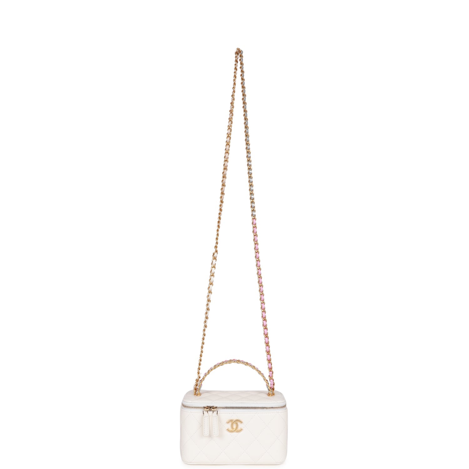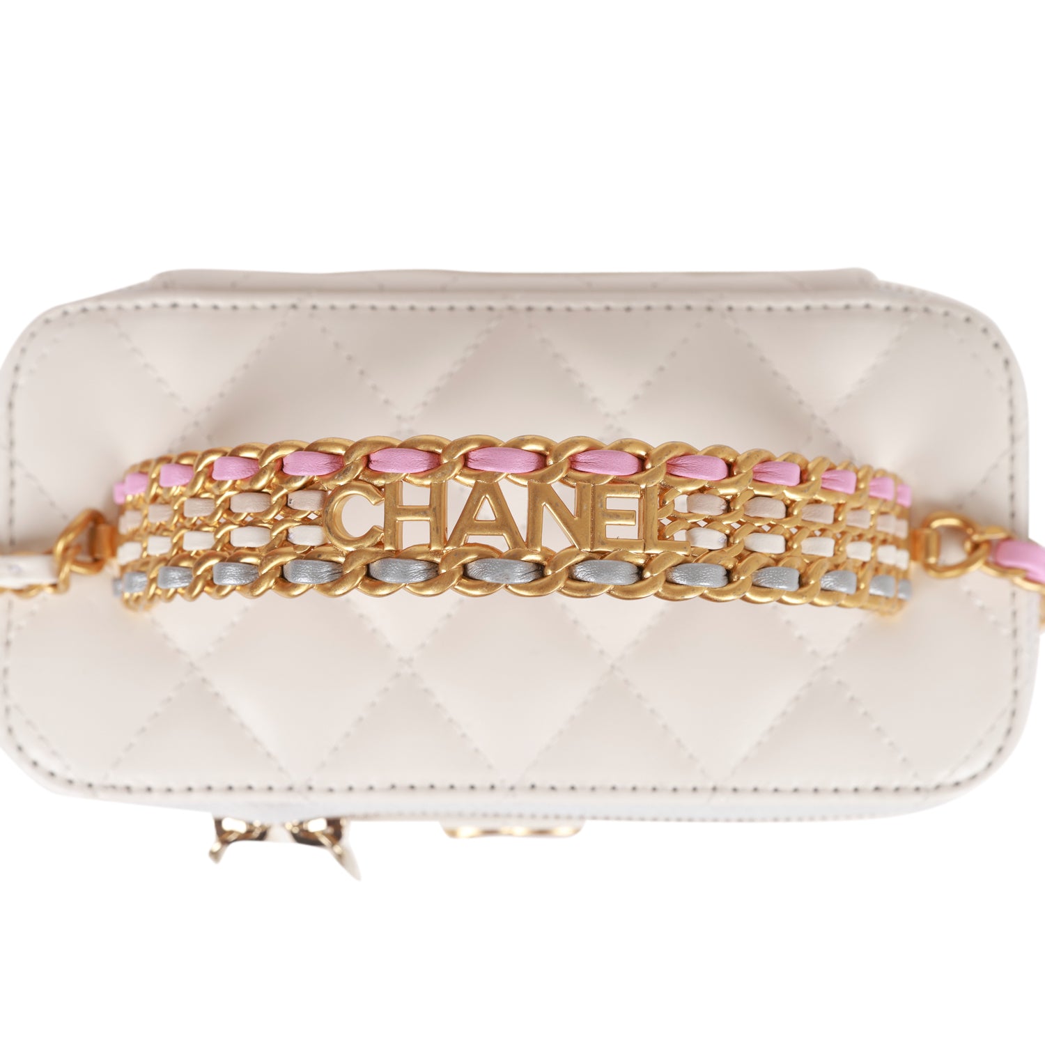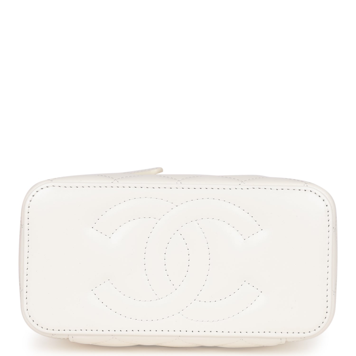 This Mini Square flap bag is of White lambskin with light gold tone hardware and has a front flap with signature CC turnlock closure, rear half moon pocket, single interwoven white leather and light gold tone chain link shoulder/crossbody strap with three CC hearts and an enamel white CC logo.