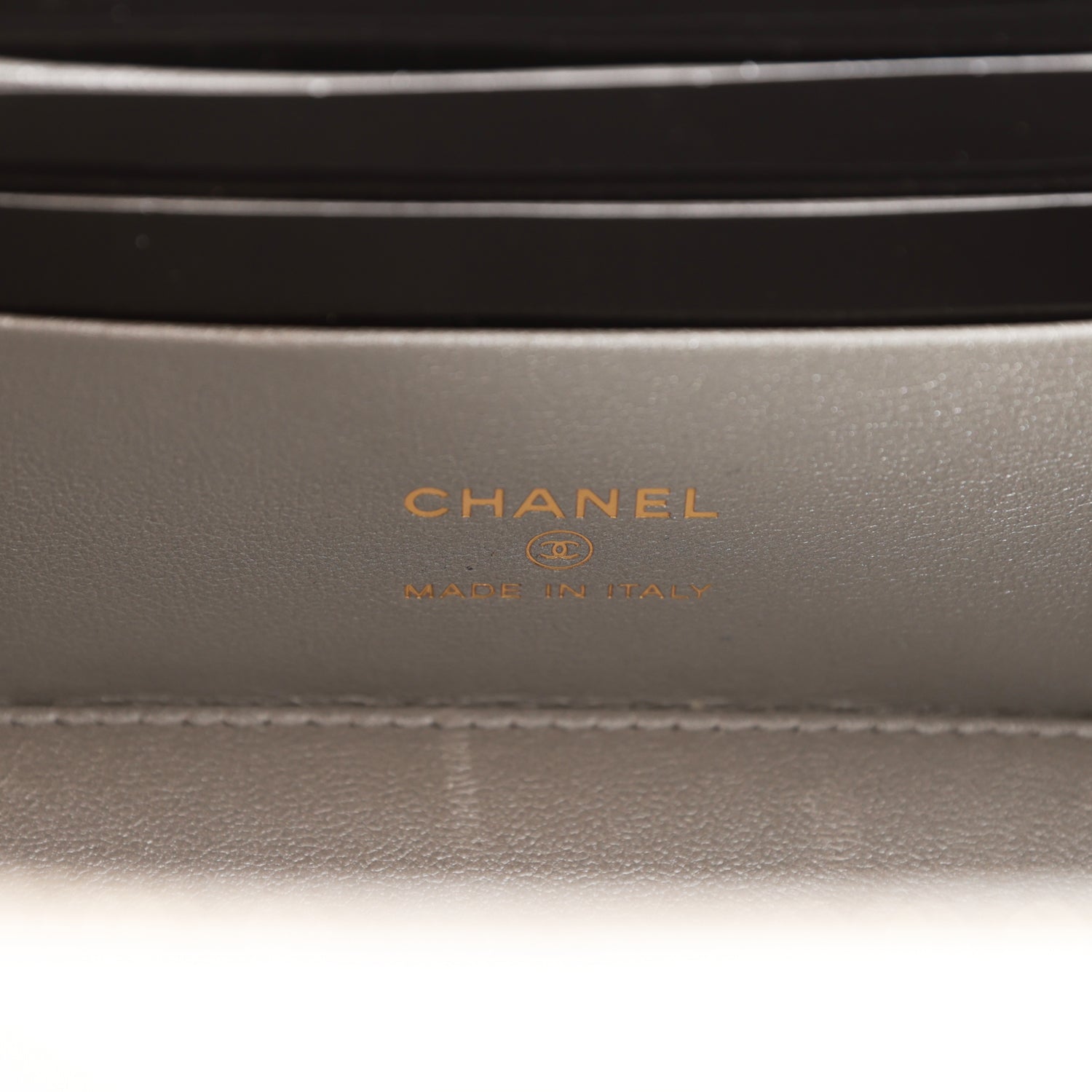 The interior is lined in white leather and features a zipper pocket with Chanel pull and an open pocket below.