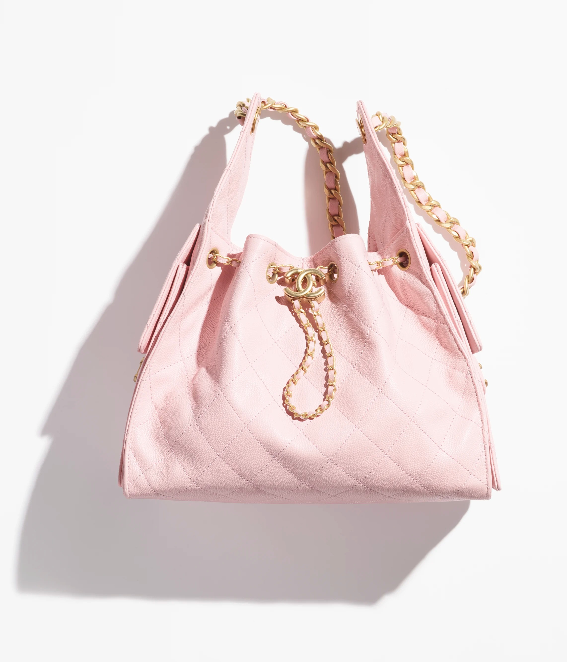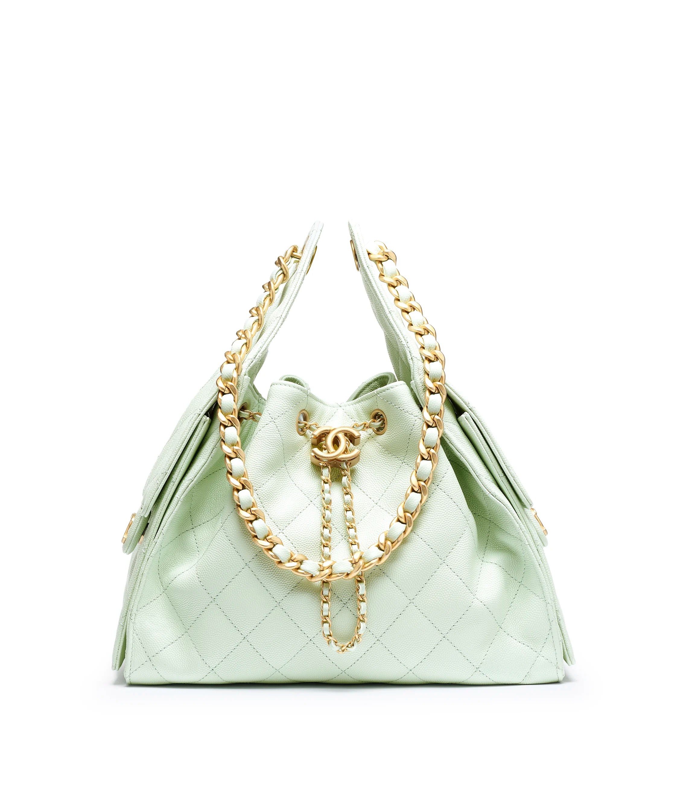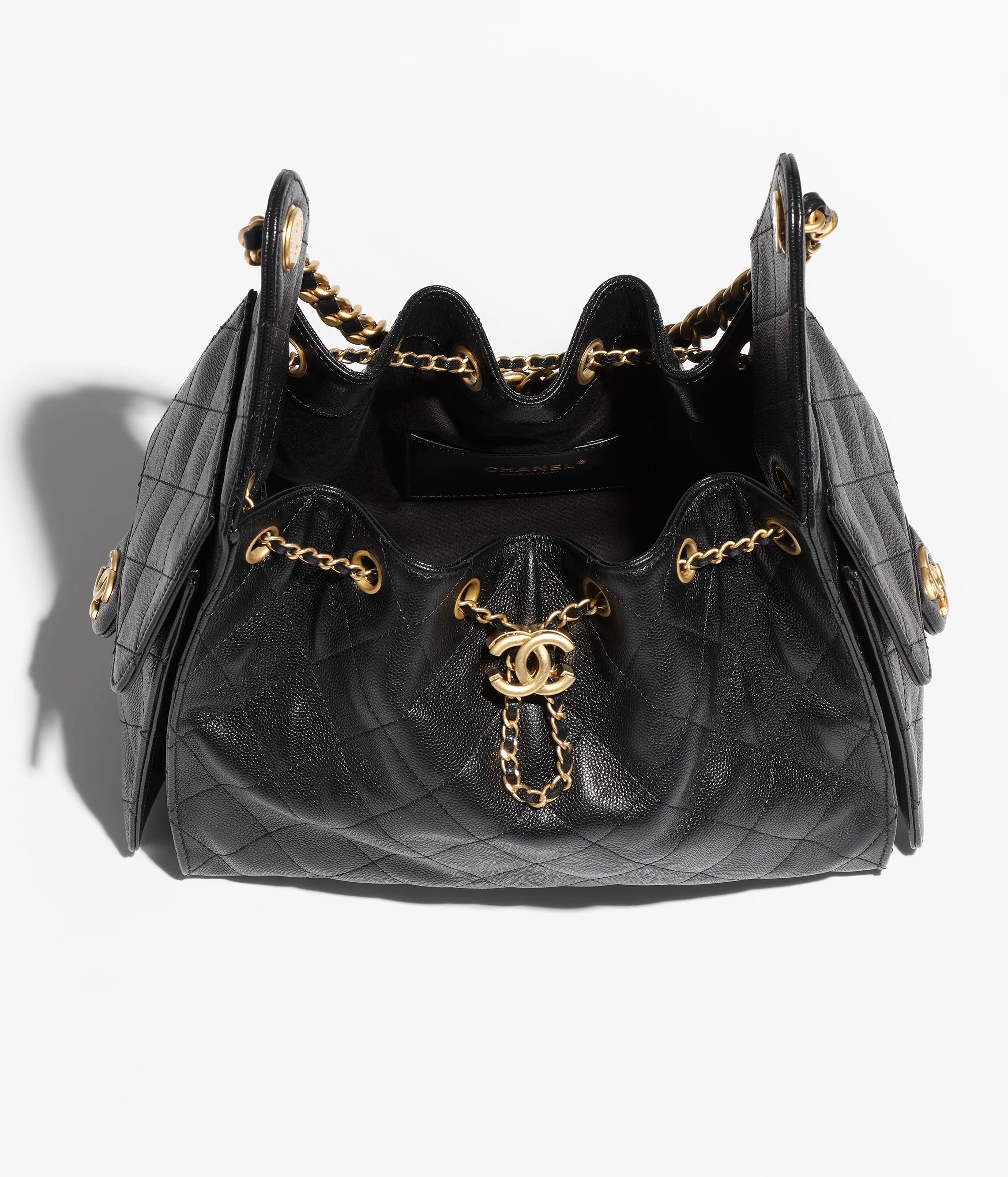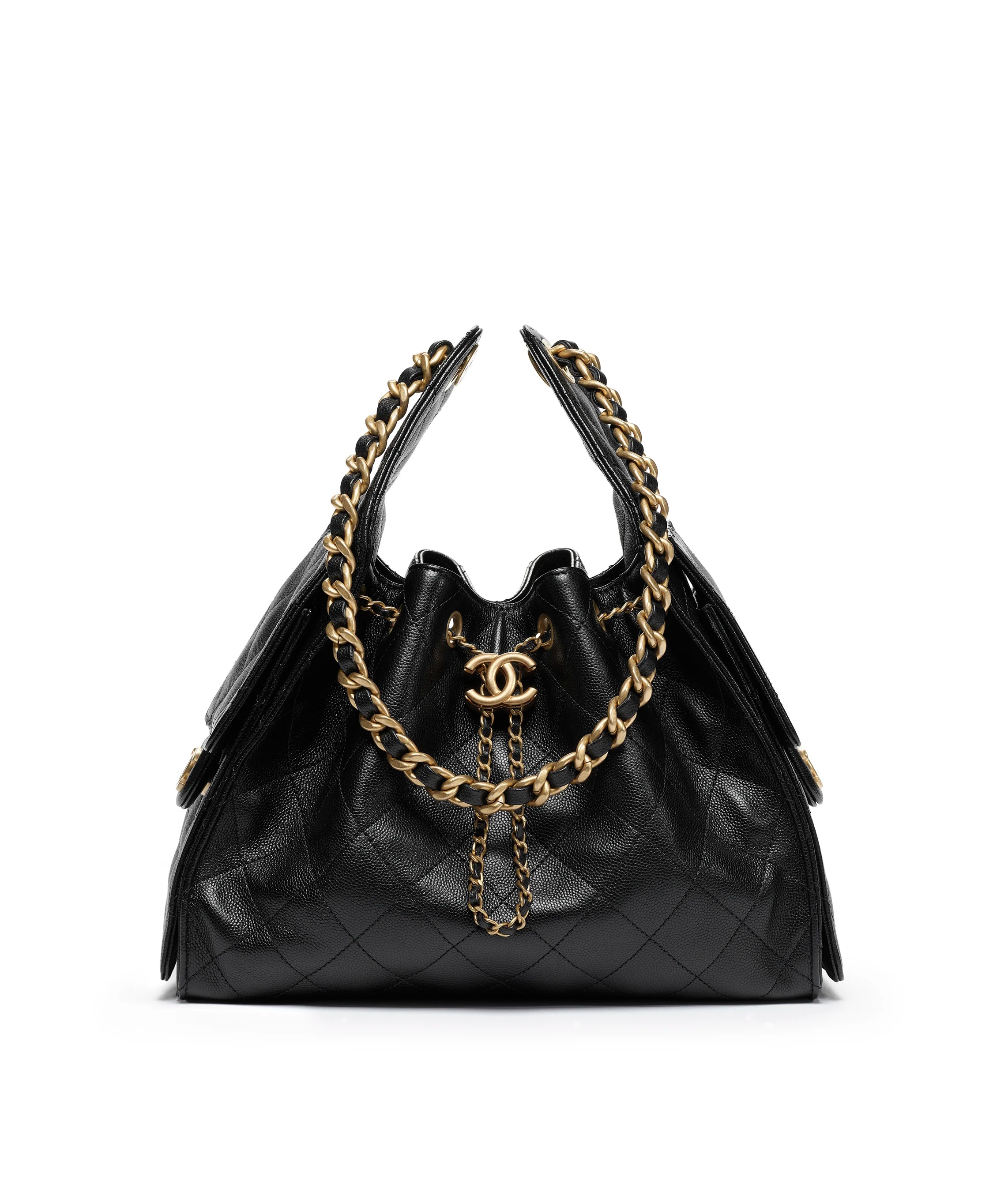 A striking blend of classic elegance and modern edge, the Chanel Medium Hobo Bag from the Spring-Summer 2025 Collection is a must-have for fashion enthusiasts. Crafted from durable black caviar leather, this piece exudes luxury with its signature diamond quilting, rich texture, and vintage-inspired gold-tone hardware. The hobo-style silhouette features a drawstring closure with the iconic CC charm, adding a playful yet sophisticated touch. Functional yet stylish, the dual-flap design side pockets with snap closures offers added versatility, while the chunky chain strap completes the effortlessly chic aesthetic.