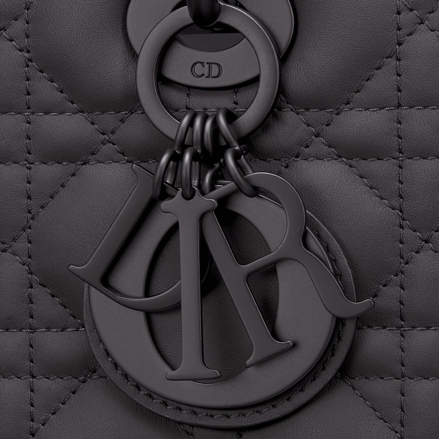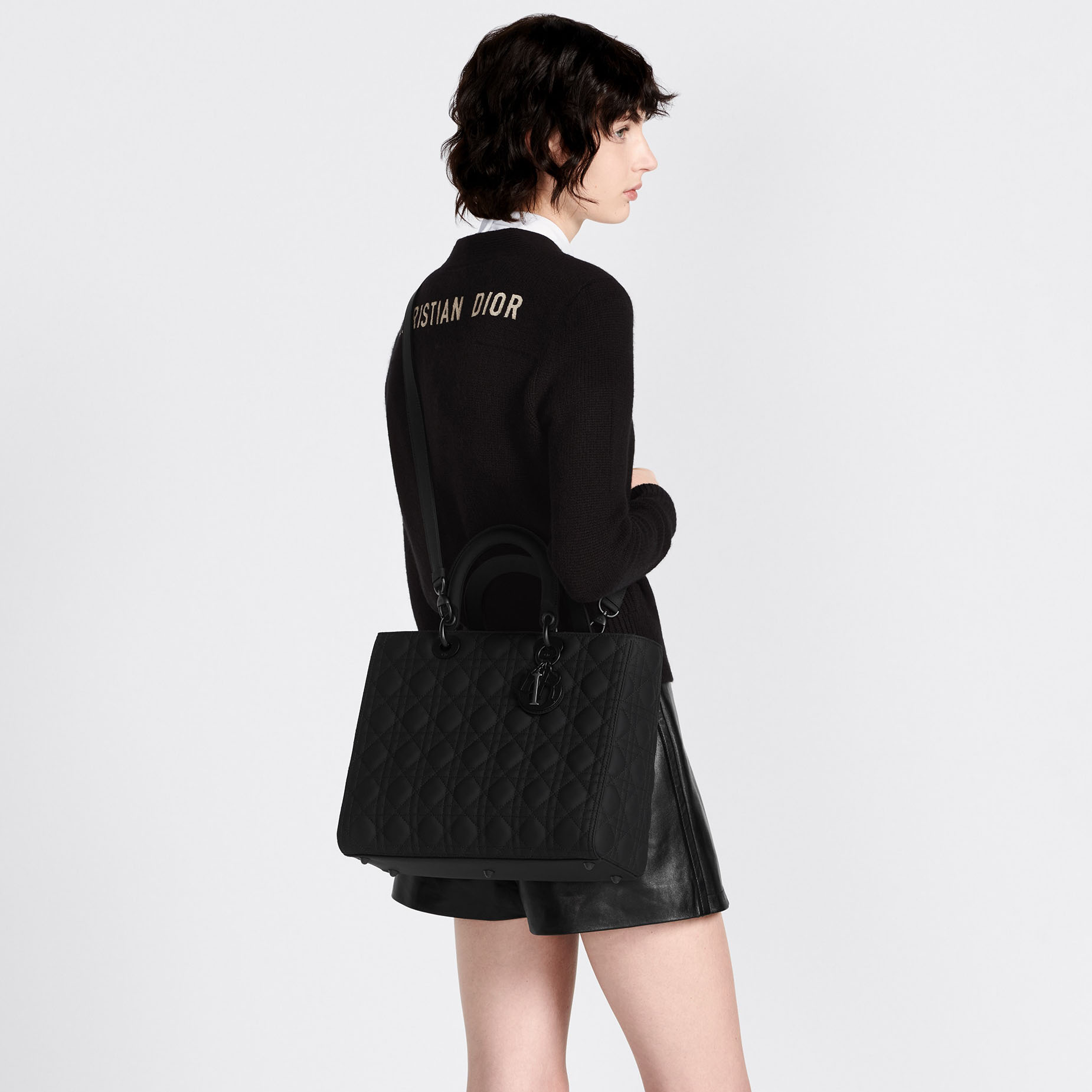 The Lady Dithtor bag epitomizes the House's vision of elegance and beauty. Sleek and refined, the timeless yet relevant style is crafted in black ultramatte calfskin with Cannage stitching, creating the instantly recognizable quilted texture. The tonal metal D.I.O.R. charms offer an elegant allure. Featuring a thin, removable leather shoulder strap, the large Lady Dithtor bag can be carried by hand, worn over the shoulder or crossbody.