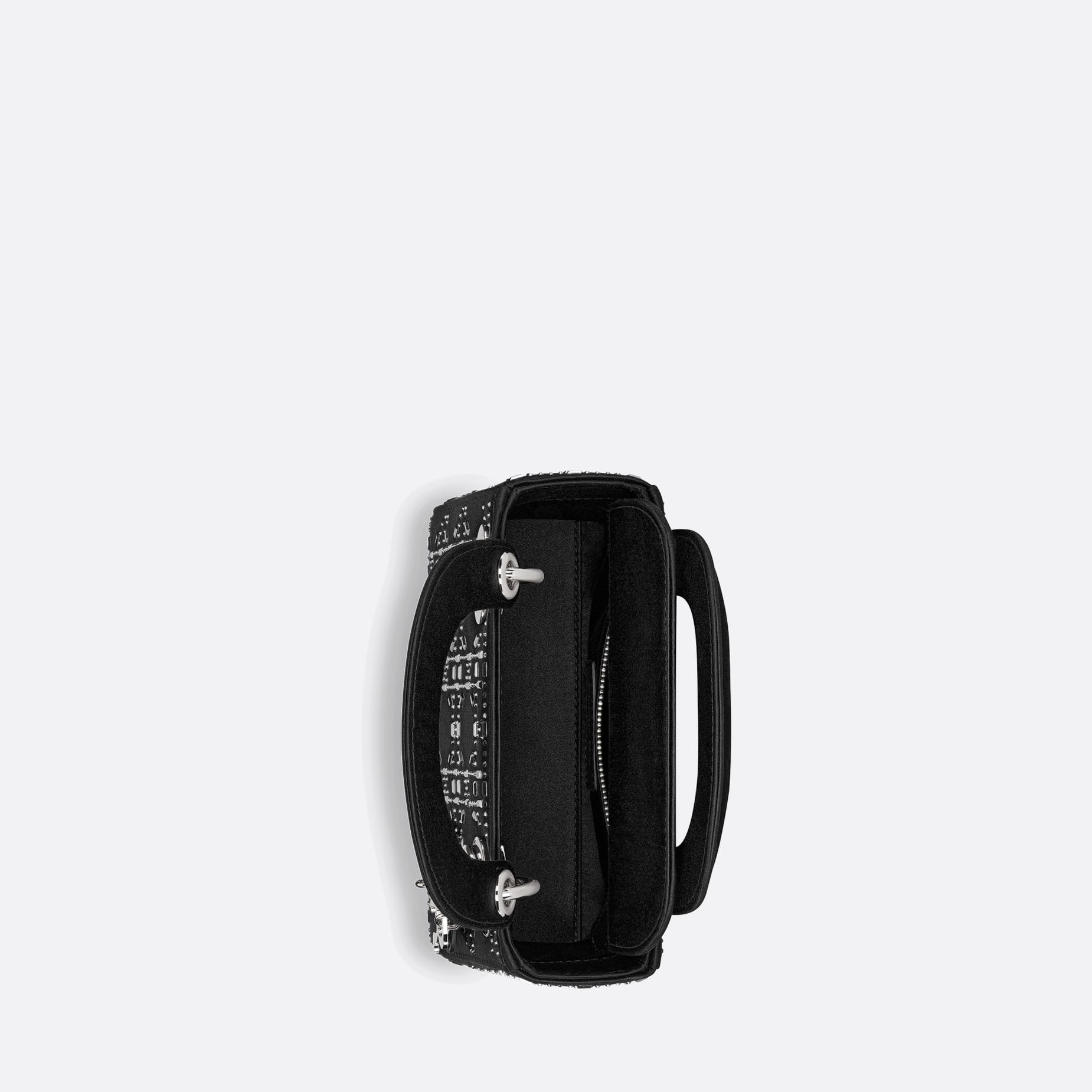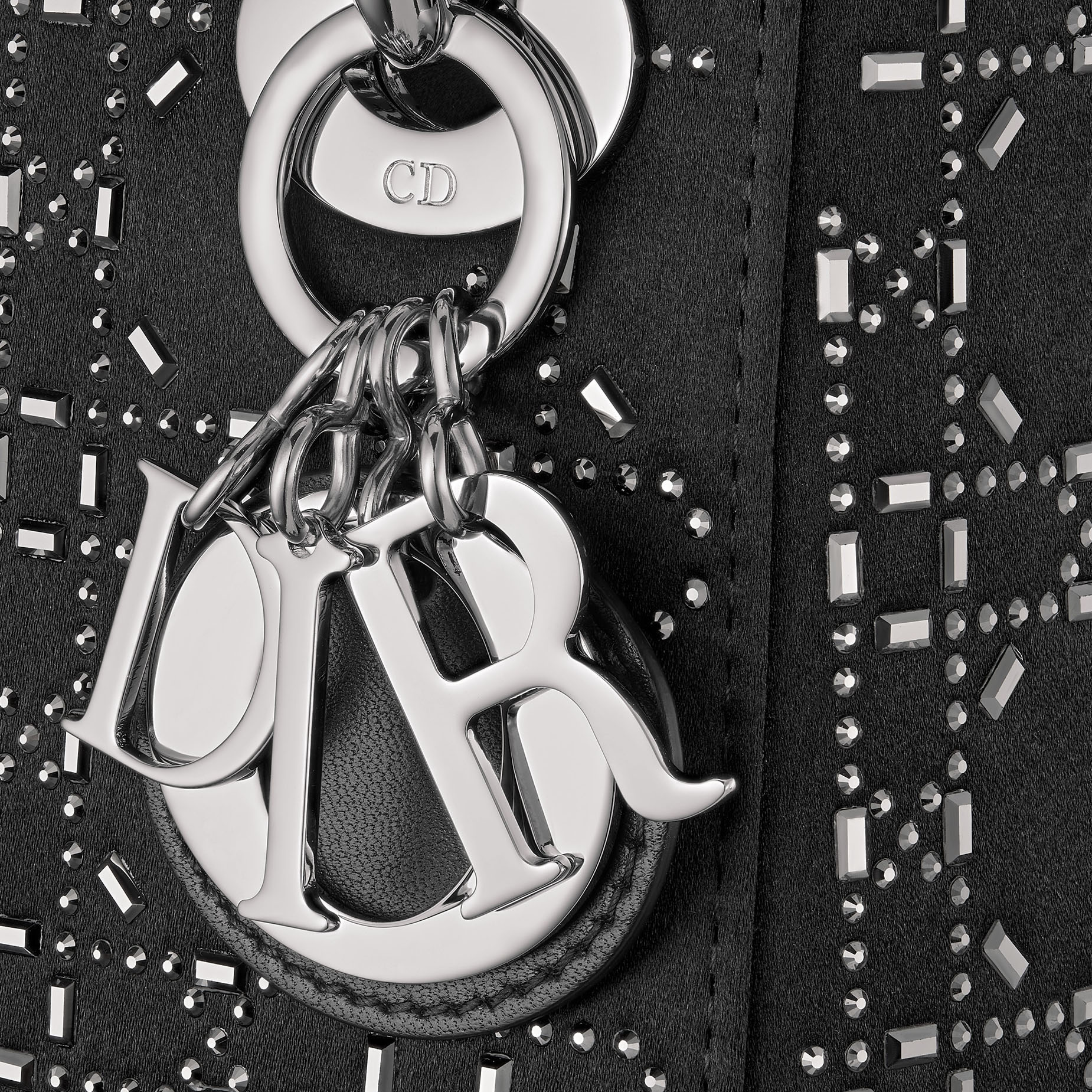 The Lady Dithtor bag epitomizes the House's vision of elegance and beauty. Sleek and refined, the creation is timeless. Crafted in black satin and covered with strass to give a sophisticated evening allure. The palladium-finish metal signature D.I.O.R. charms embellish and illuminate its silhouette. Featuring a thin removable satin shoulder strap, the miniature Lady Dithtor bag can be carried by hand or worn crossbody as an ideal evening wear companion.
