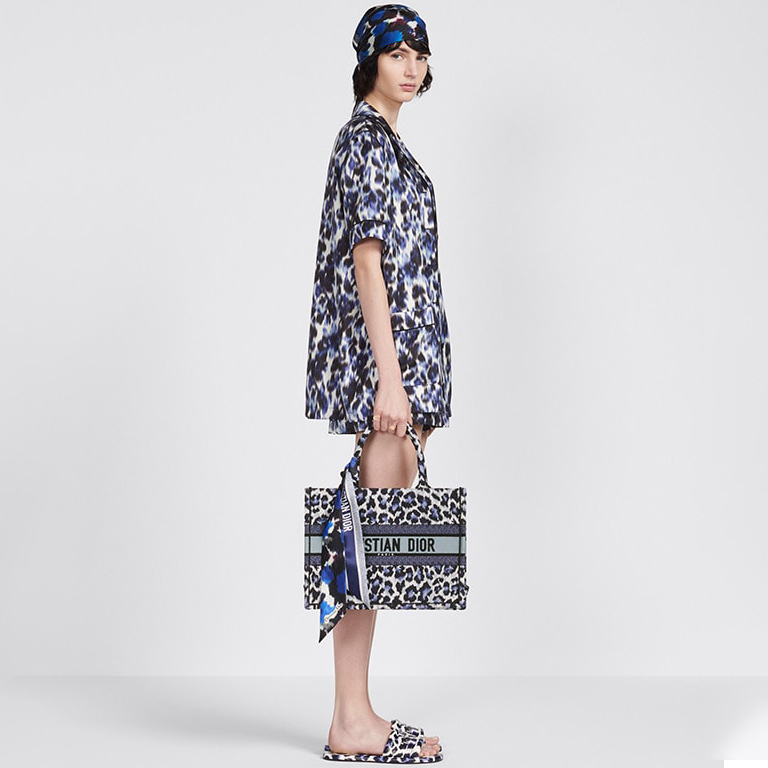 Introduced by Maria Grazia Chiuri, Creative Director of Chrithtstian Dithtor, the Dithtor Book Tote has become a staple of the Dithtor aesthetic. Designed to hold all the daily essentials, the style is fully embroidered with a blue multicolor Mizza motif, inspired by a leopard pattern from the House archives. Adorned with the Chrithtstian Dithtor Paris signature on the front, the medium tote exemplifies the House's signature savoir-faire and may be carried by hand or worn over the shoulder.