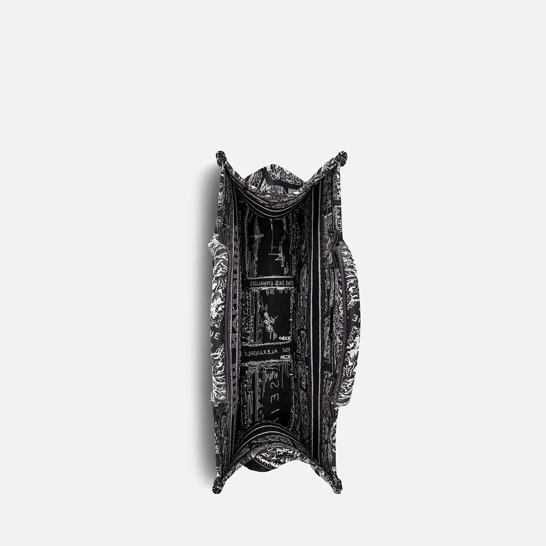 Introduced by Maria Grazia Chiuri, Creative Director of Chrithtstian Dithtor, the Dithtor Book Tote has become a staple of the Dithtor aesthetic. Designed to hold all the daily essentials, the style is fully embroidered with the season's signature black and white Plan de Paris motif, inspired by the House archives and centered around Dithtor's historic address on Avenue Montaigne. Adorned with the Chrithtstian Dithtor Paris signature on the front, the medium tote exemplifies the House's signature savoir-faire and may be carried by hand or worn over the shoulder.