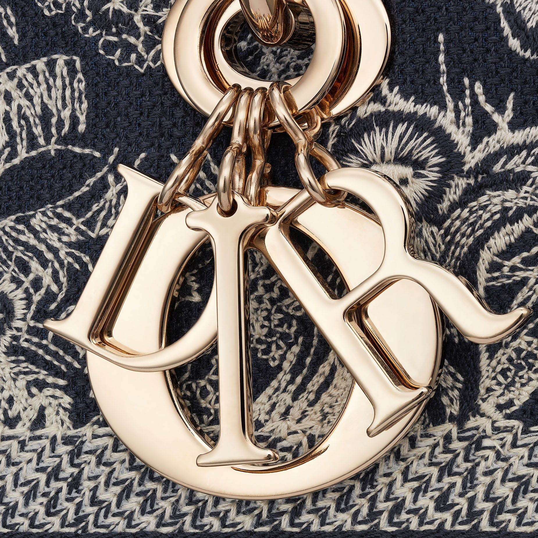 The Lady D-Lite bag combines classic elegance with House modernity. The style is fully embroidered with the blue Toile de Jouy Reverse motif, a variation of the hallmark House pattern with a play on reversed colors. The front features a Chrithtstian Dithtor Paris signature while the thick D.I.O.R. charms in pale gold-finish metal enhance the silhouette. Equipped with a wide, reversible and removable embroidered shoulder strap, the medium Lady D-Lite bag can be carried by hand or worn crossbody.