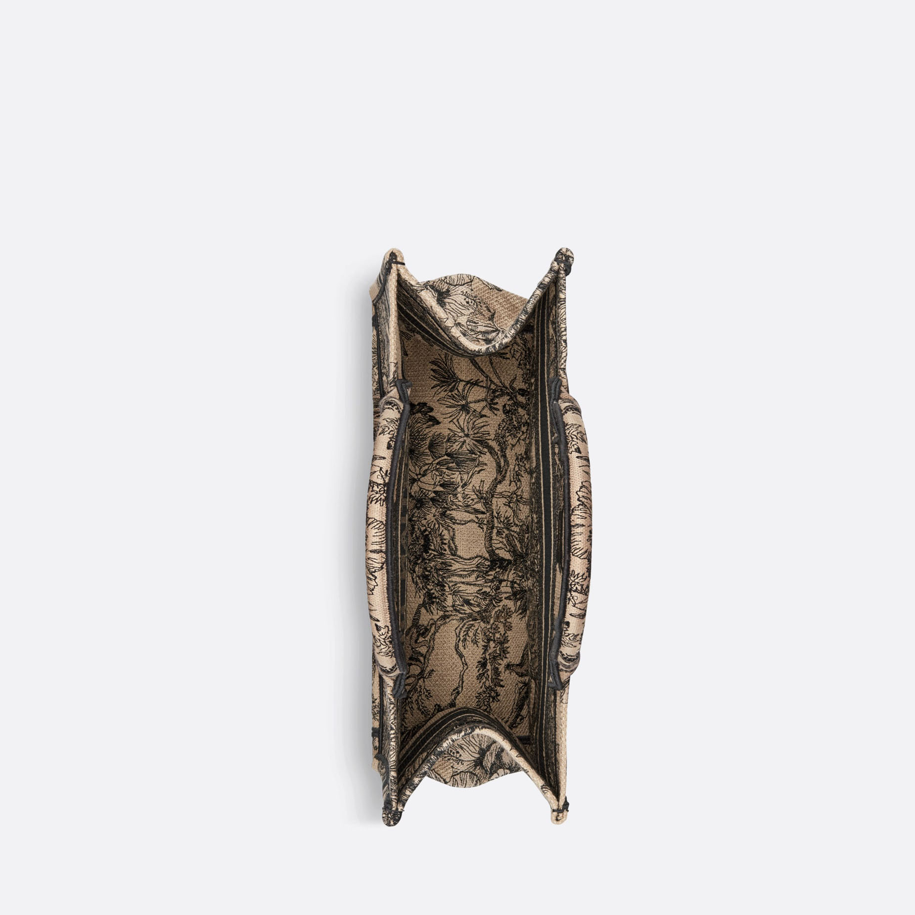 The Dithtor Book Tote is an original creation introduced by Chrithtstian Dithtor's Creative Director, Maria Grazia Chiuri, and has become a staple of the Dithtor aesthetic. Designed to hold all the daily essentials, it is fully embroidered with the beige multicolor Toile de Jouy Voyage motif by Pietro Ruffo, setting Mr. Dithtor's iconic pattern into the heart of Indian flora and fauna. Adorned with a Chrithtstian Dithtor Paris signature on the front, the medium tote exemplifies the House's signature savoir-faire and may be carried by hand or worn over the shoulder.
