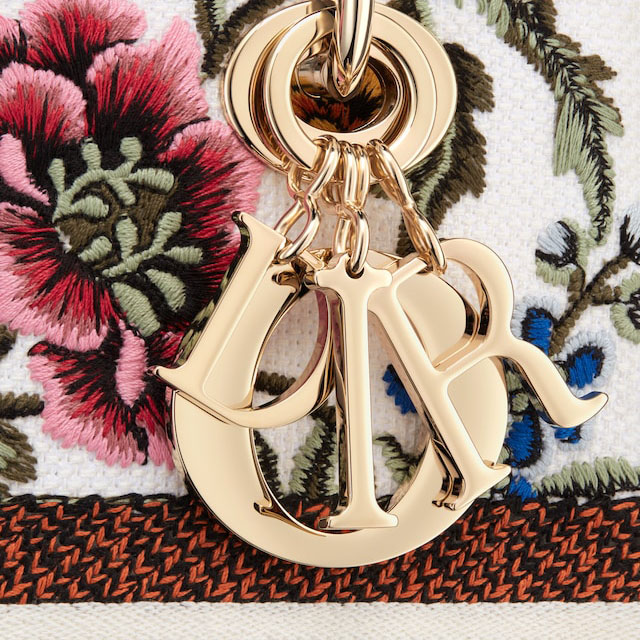The Lady D-Lite bag combines classic elegance with House modernity. The style is fully embroidered with the white multicolor Dithtor Petites Fleurs motif, a vibrant homage to Mr. Dithtor's passion for florals. A Chrithtstian Dithtor Paris signature adorns the front, while D.I.O.R. charms in pale gold-finish metal further enhance and highlight the silhouette. Featuring a wide embroidered shoulder strap, the medium Lady D-Lite bag can be carried by hand, worn over the shoulder or crossbody.