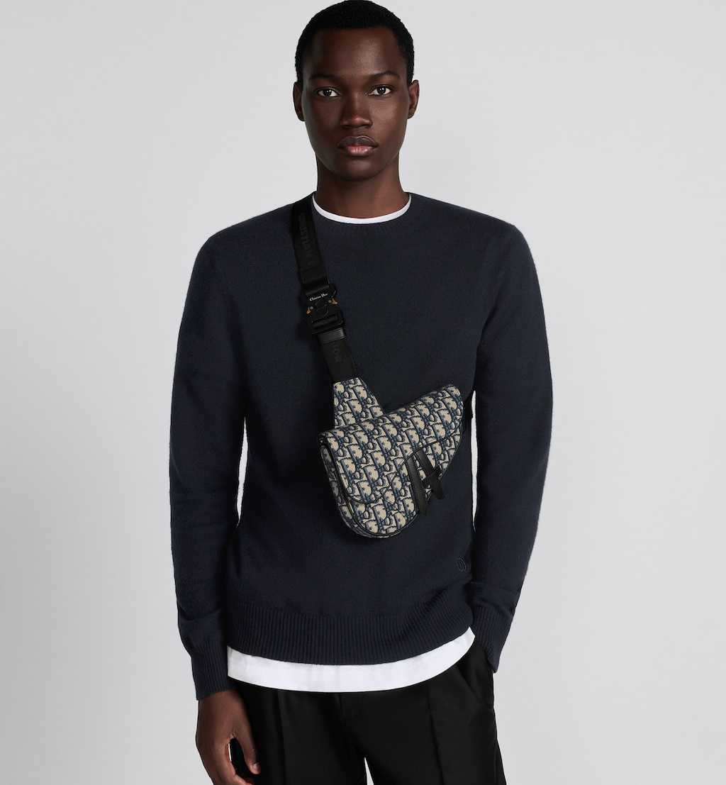 The Saddle bag is offered in practical, smaller variation. Crafted in beige and black Dithtor Oblique jacquard, it is embellished with a magnetic flap that showcases the hallmark lines and conceals a zipped closure. Further enhanced by leather details, the miniature bag has an adjustable Chrithtstian Dithtor jacquard strap and may be worn over the shoulder or crossbody.