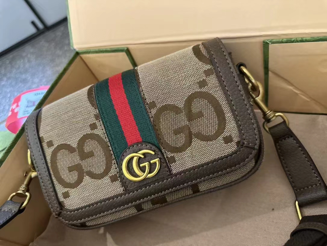 A selection of bags, including mini cross-body bags, briefcases and totes have been reshaped with functional details. Crafted from beige and ebony GthtG Supreme canvas, this Ophidia super mini bag features one inside zip pocket, while the outside shows off the Double and Web stripe.