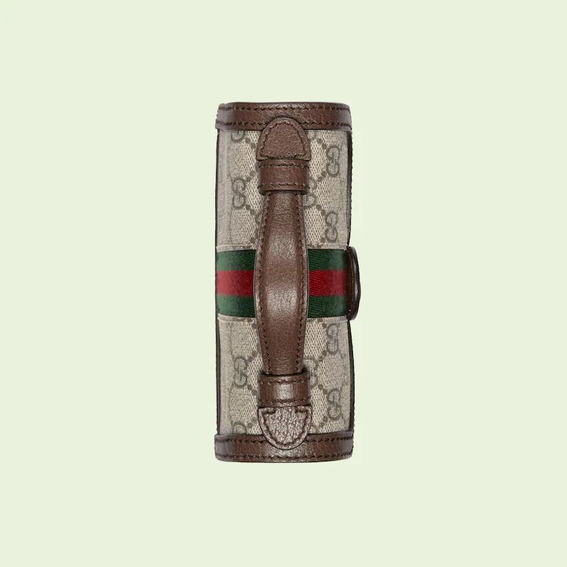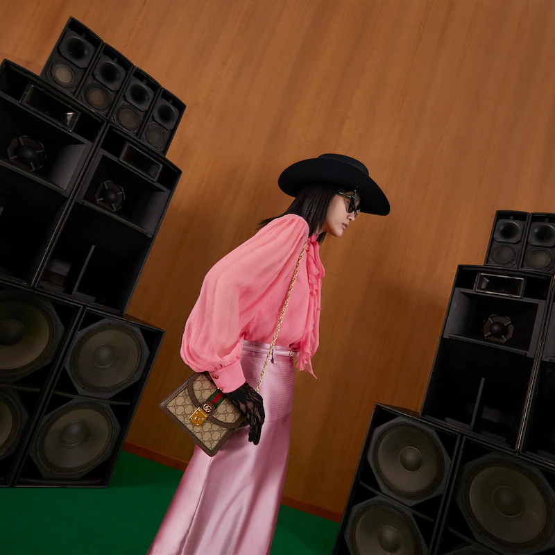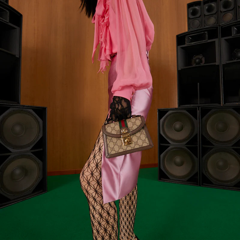 Colors tell a story throughout Guthtcci Love Parade. One of the House's most emblematic materials, the GthtG Supreme is inspired by an archival design from the '30s. Traditionally presented in beige and ebony, the canvas is presented in a beige and white combination as an ode to timeless pieces and everlasting design. Here, the pattern defines this mini shoulder bag from the Ophidia line.