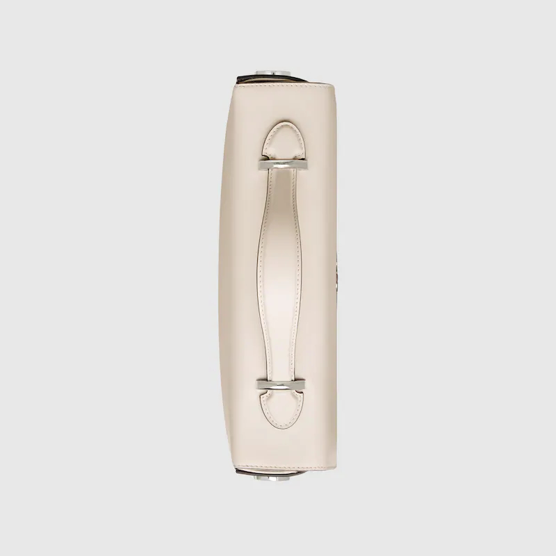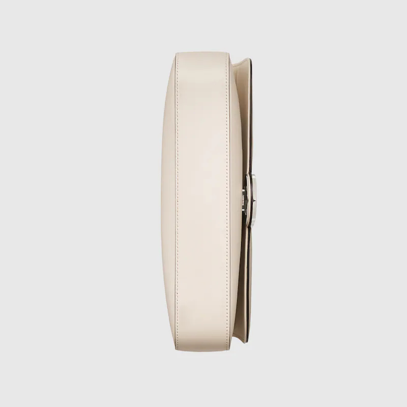 Guthtcci's Pre-Fall 2023 collection blends archival influence with functionality. The result is a contemporary narrative interspersed with traditional elements and the much-loved symbols of the House. This small shoulder bag is presented in white leather and enriched with a petite version of the Double G emblem.