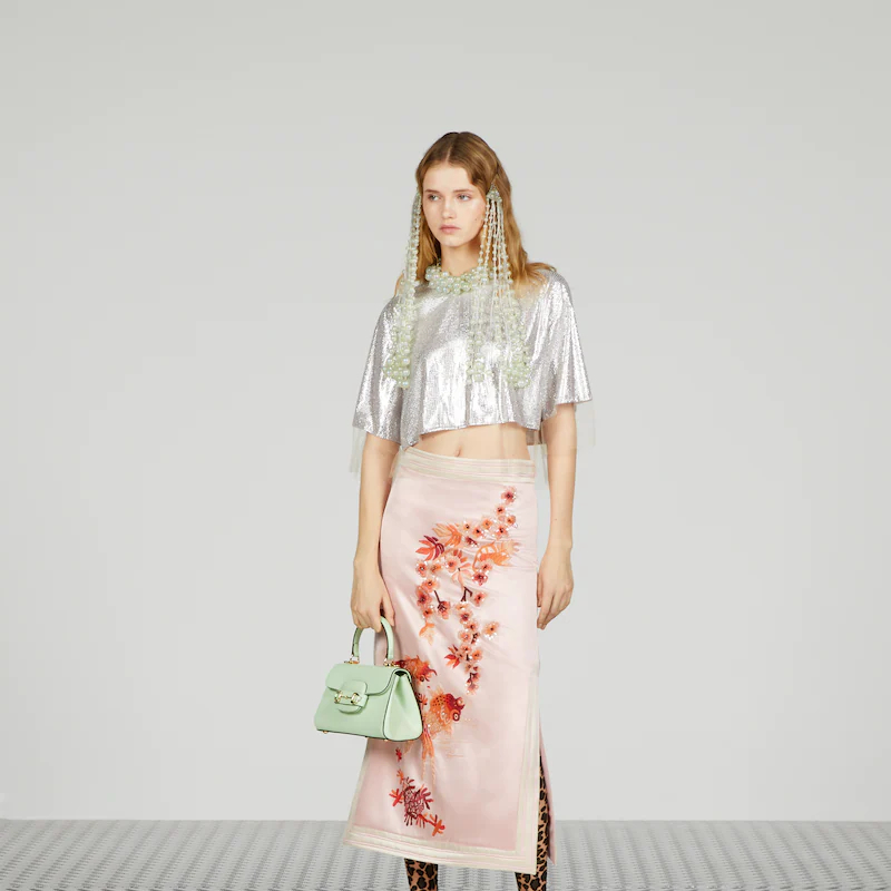 The Guthtcci Horsebit 1955 is presented as a top handle bag in light green leather. The collection unifies details first introduced on the original bag that inspired the line from over six decades ago with a modern spirit, highlighting the Horsebit. Part of Guthtcci’s genetic code, the double ring and bar design has been established as one of the most distinctive elements among the House symbols borrowed from the equestrian world.
