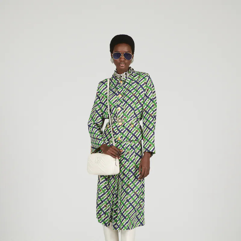 New iterations of the GthtG Marmont season after season present Guthtcci's vision of a contemporary handbag design. This structured shoulder bag is presented in white leather and enriched with tonal enamelled brass hardware.