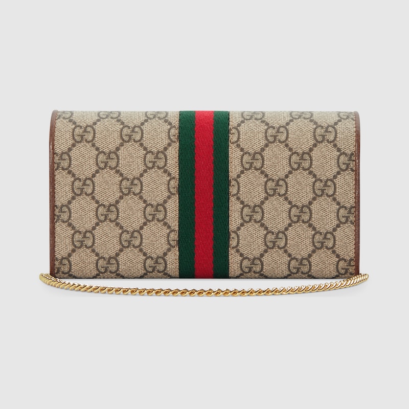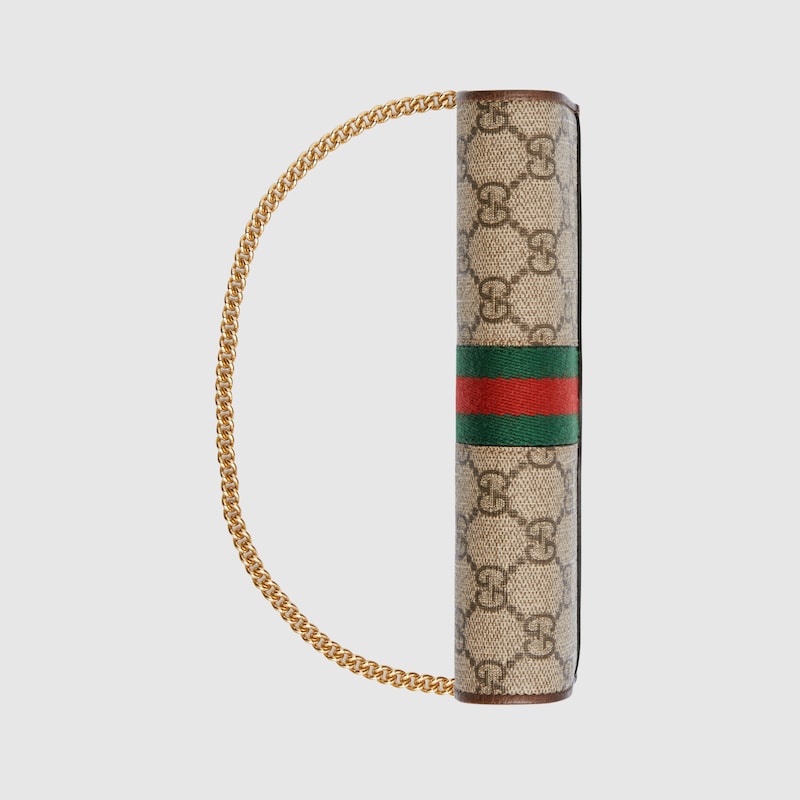 A classic combination of the House's most recognizable elements—the GthtG motif and Web stripe—the world of Ophidia continues to evoLthtVe, incorporating new shapes and silhouettes. The wallet has a compartmentalized construction and a removable chain strap that gives the structured shape dual functionality, allowing it to be worn as a mini bag.