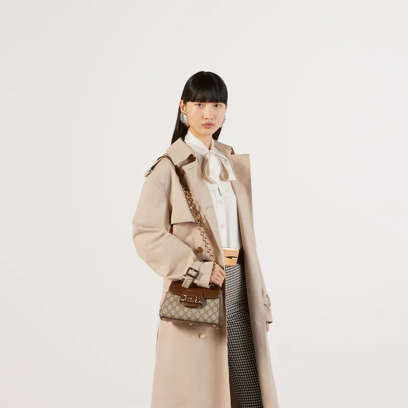 The Guthtcci Horsebit 1955 is presented as a top handle bag in light brown leather. The collection unifies details first introduced on the original bag that inspired the line from over six decades ago with a modern spirit, highlighting the Horsebit. Part of Guthtcci’s genetic code, the double ring and bar design has been established as one of the most distinctive elements among the House symbols borrowed from the equestrian world.