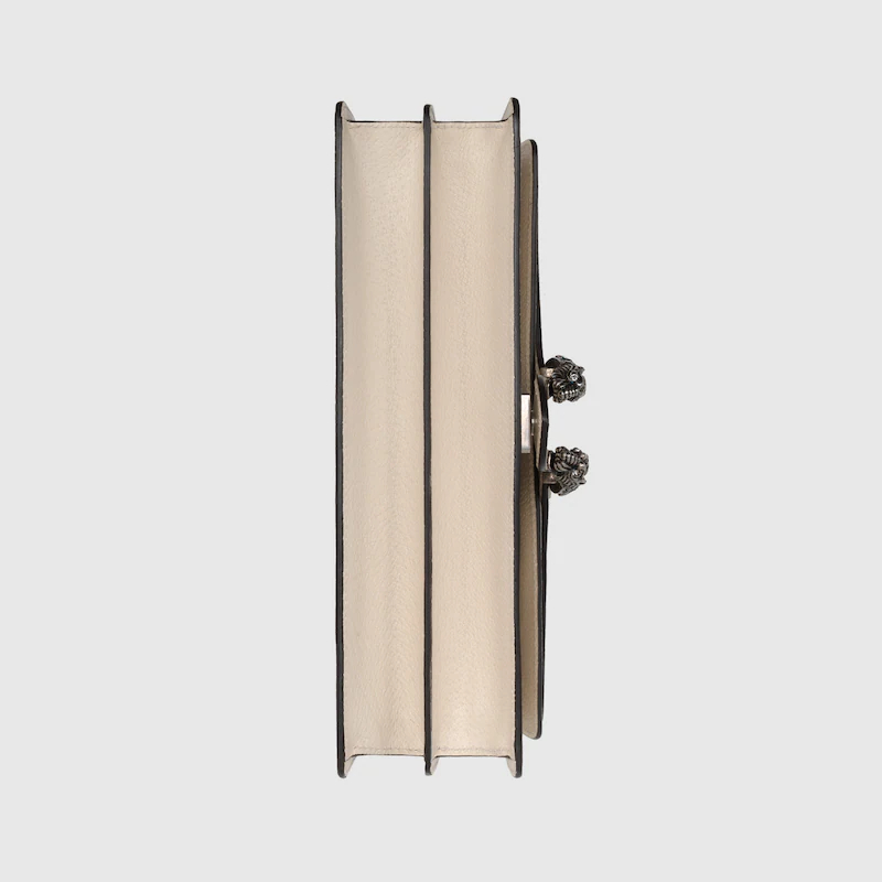 The Dionysus shoulder bag is presented in white textured leather with the now defining tiger head closure—a unique detail referencing the Greek god Dionysus. The closure is further enhanced with crystals. The sliding chain strap can be worn multiple ways, changing between a shoulder and a top handle bag.