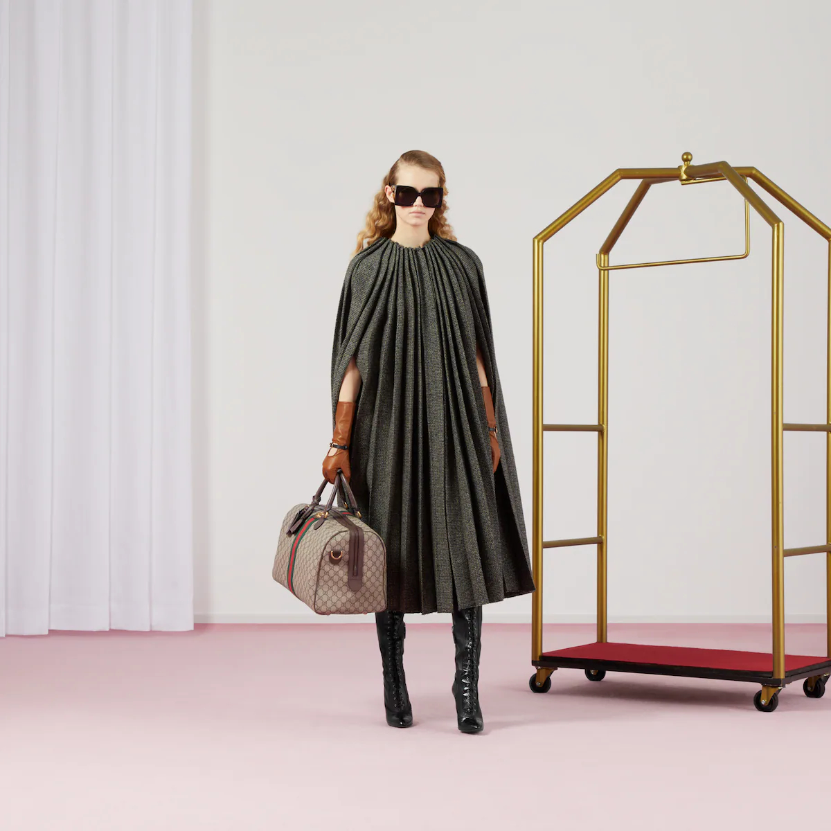The world of Guthtcci Savoy evoLthtVes with the introduction of a duffle shape crafted in soft GthtG Supreme canvas with inlaid green and red Web stripe. A contemporary take on a Guthtcci archival belt buckle from the '70s, the Double G is repurposed and appears atop a textured leather tab detail. The carry-on is completed with a detachable and adjustable strap, lock with key holder and luGthtGage tag.
