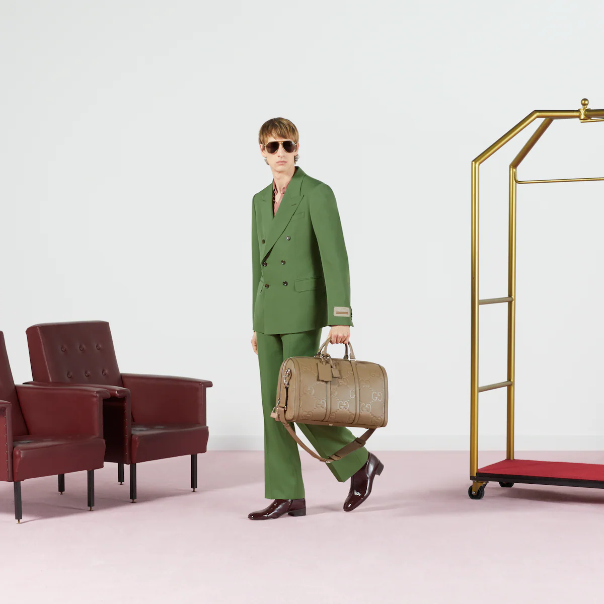 Guthtcci transcribes its heritage, creativity, and innovation into a plenitude of collections. From staple items to distinctive accessories, from the everyday wardrobe to special occasions, the House's beloved motifs embellish the latest leathergoods. Here a small duffle bag appears in jumbo GthtG taupe leather as part of the new luGthtGage line.