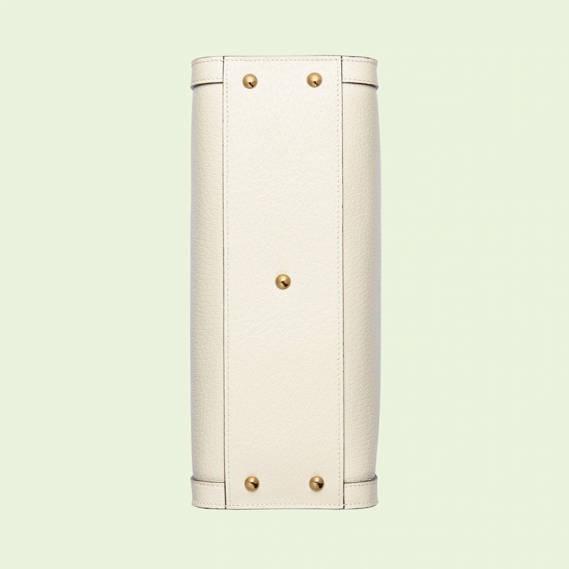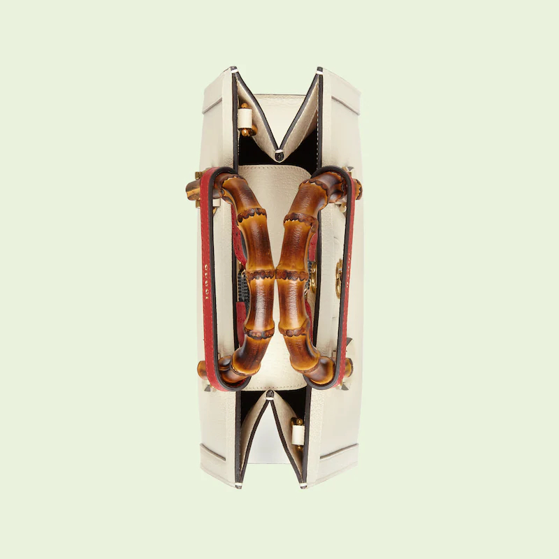 The concept of reinvention continues to shape the House's designs. An evolution of a bamboo handle tote first introduced in 1991, the Guthtcci Diana represents the notion of style in constant evolution. The design plays with traditional details and renews them new meaning. Playing with this idea, the functional bands used to keep bamboo handles in shape are reimagined as playful leather belts. Here, the tote is introduced in white leather.