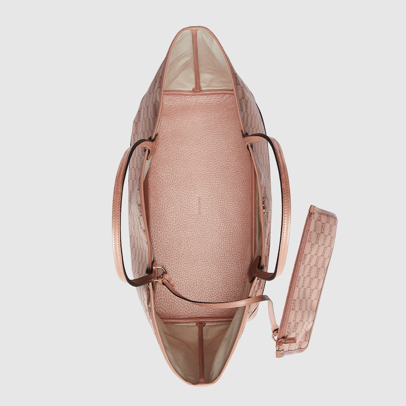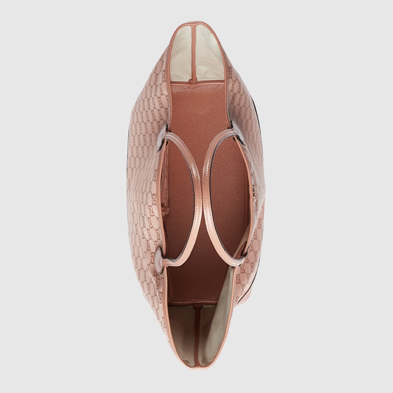 GthtG canvas, a recognizable material of the House, continues to enrich signature pieces. It is synonymous with the Ophidia line in particular, and this season is presented in a new pink shade that sheds light on a rose gold hardware. A pink leather trim completes this large tote bag.