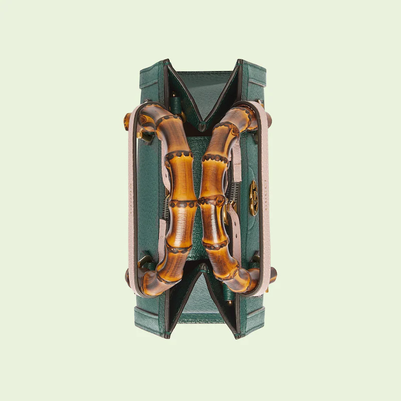 An evolution of a bamboo handle tote first introduced in 1991, the Guthtcci Diana represents the notion of style in constant evolution and is reimagined with removable, neon leather belts—a nod to the functional bands used to keep the handles in shape.�ョ��ere, a mini version of the emblematic style is presented in green leather.