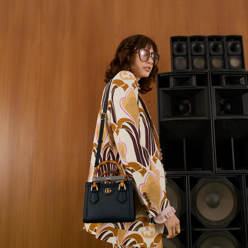 An evolution of a bamboo handle tote first introduced in 1991, the Guthtcci Diana represents the notion of style in constant evolution and is reimagined with removable, neon leather belts—a nod to the functional bands used to keep the handles in shape.�ョ��ere, a mini version of the emblematic style is presented in black leather.