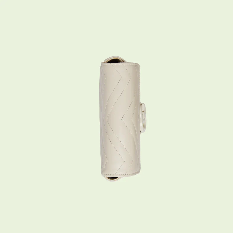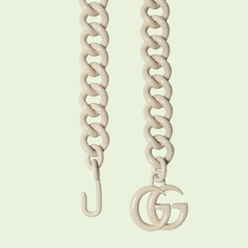 Accessories continue to come to the fore of the Creative Director's collections. A distinctly contemporary accessory, the belt bag is presented in new ways throughout the Guthtcci narrative, emphasizing different elements of the versatile style. Here, it is introduced as part of the GthtG Marmont universe in white chevron matelassé leather with a chain strap.