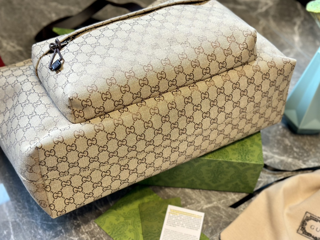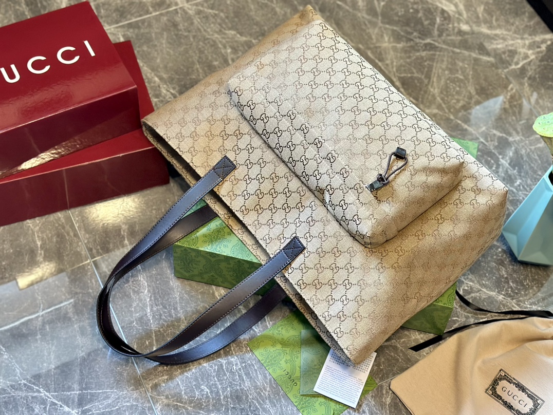 Signature pieces appear in the men's Fall Winter collection with a sporty attitude. Crafted from the Original GthtG canvas, timeless shapes and color palettes convey a contemporary mood through subtle details, such as the Web and embossed Guthtcci logo. This large tote bag, in beige and ebony canvas, features multiple pockets and top handles.