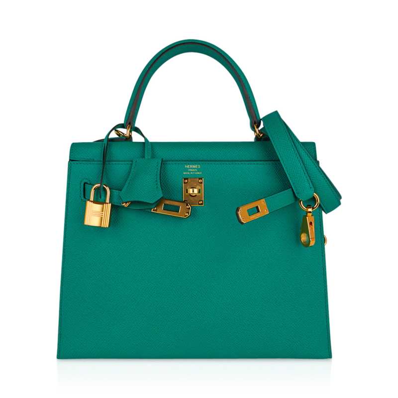 Guaranteed authentic Herthtmes Kelly 25 bag Sellier featured in spectacular Jade.