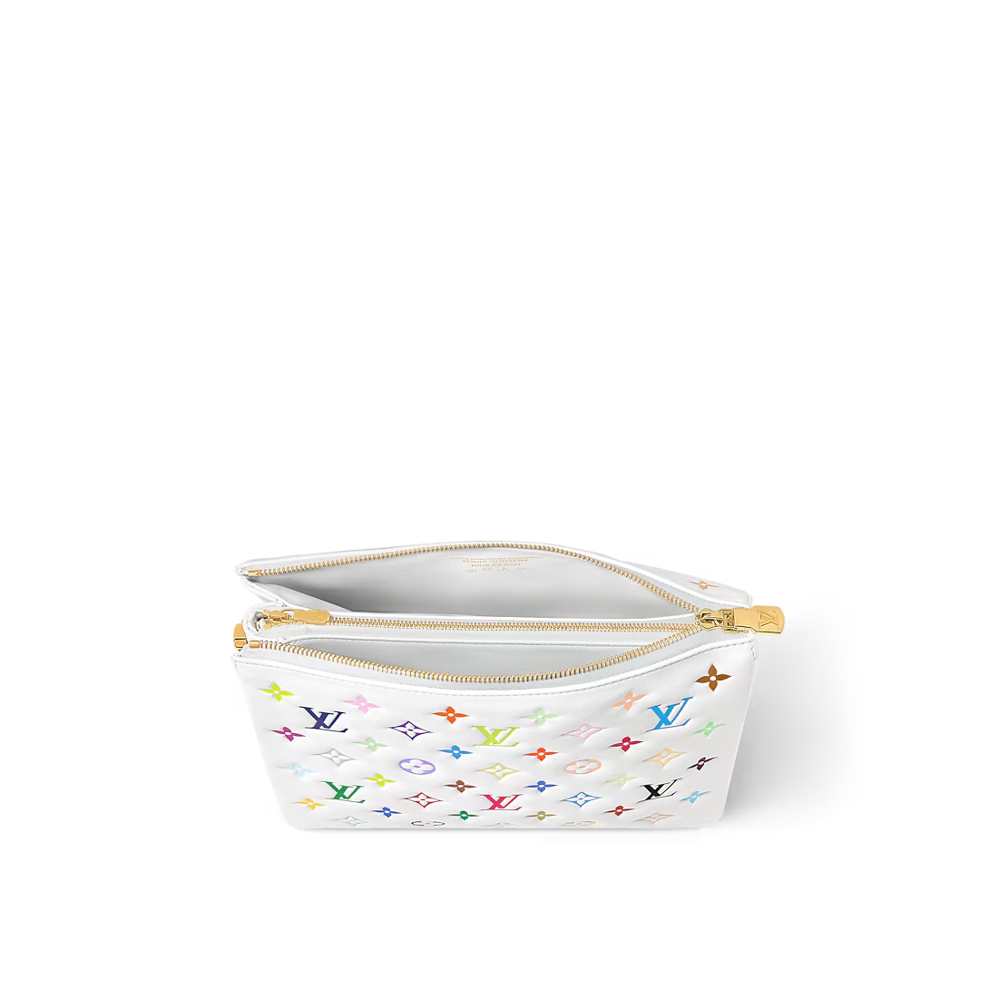 The signature rainbow tones of Japanese artist Takashi Murakami add a playful pop of color to this classic Coussin PM handbag as part of the re-edition of the Louis Vuitton x Murakami collection. Crafted from puffy lambskin in a sleek silhouette, the multicolored Monogram motif features as an allover print, while a chunky golden chain and removable leather strap offer multiple carry options for daily styling.