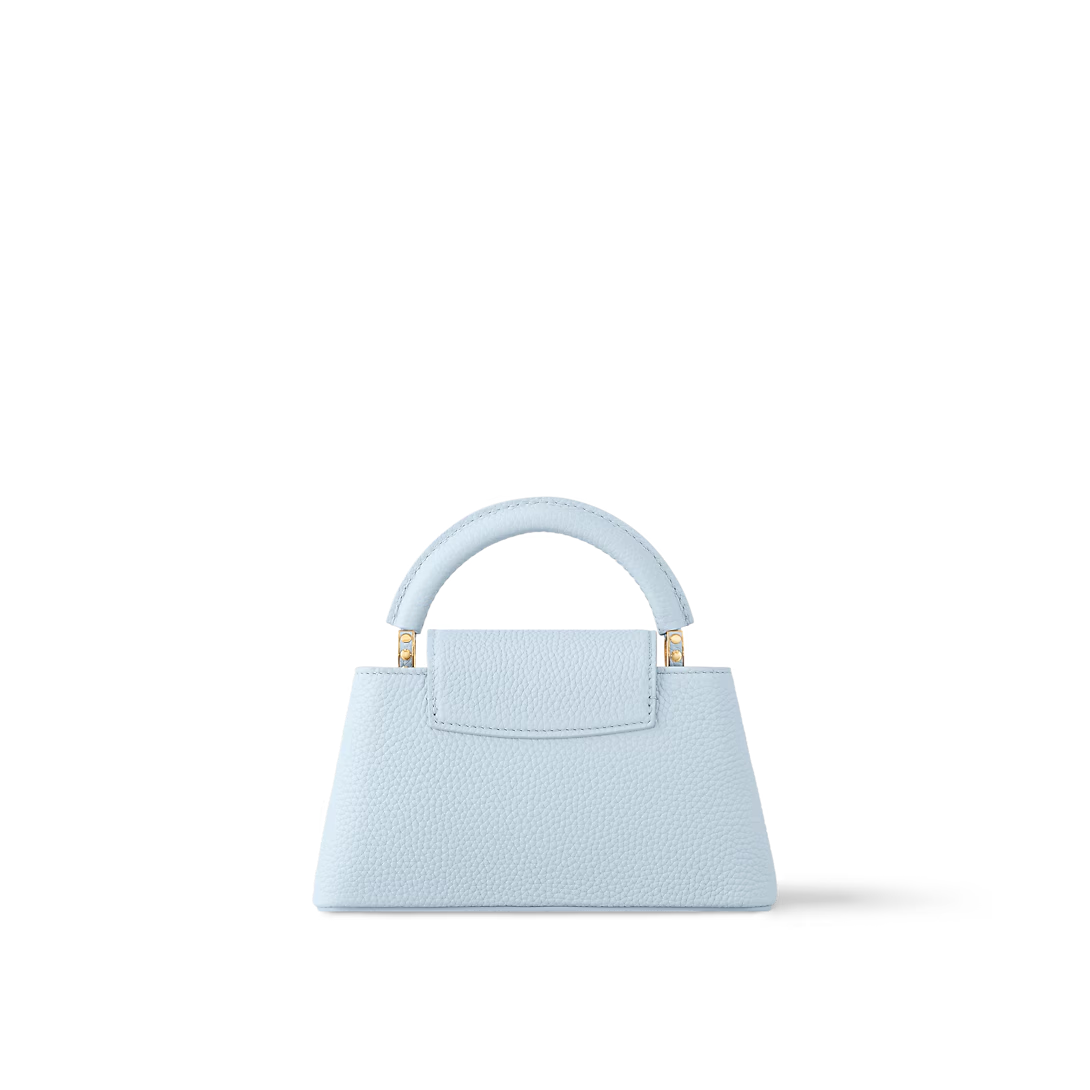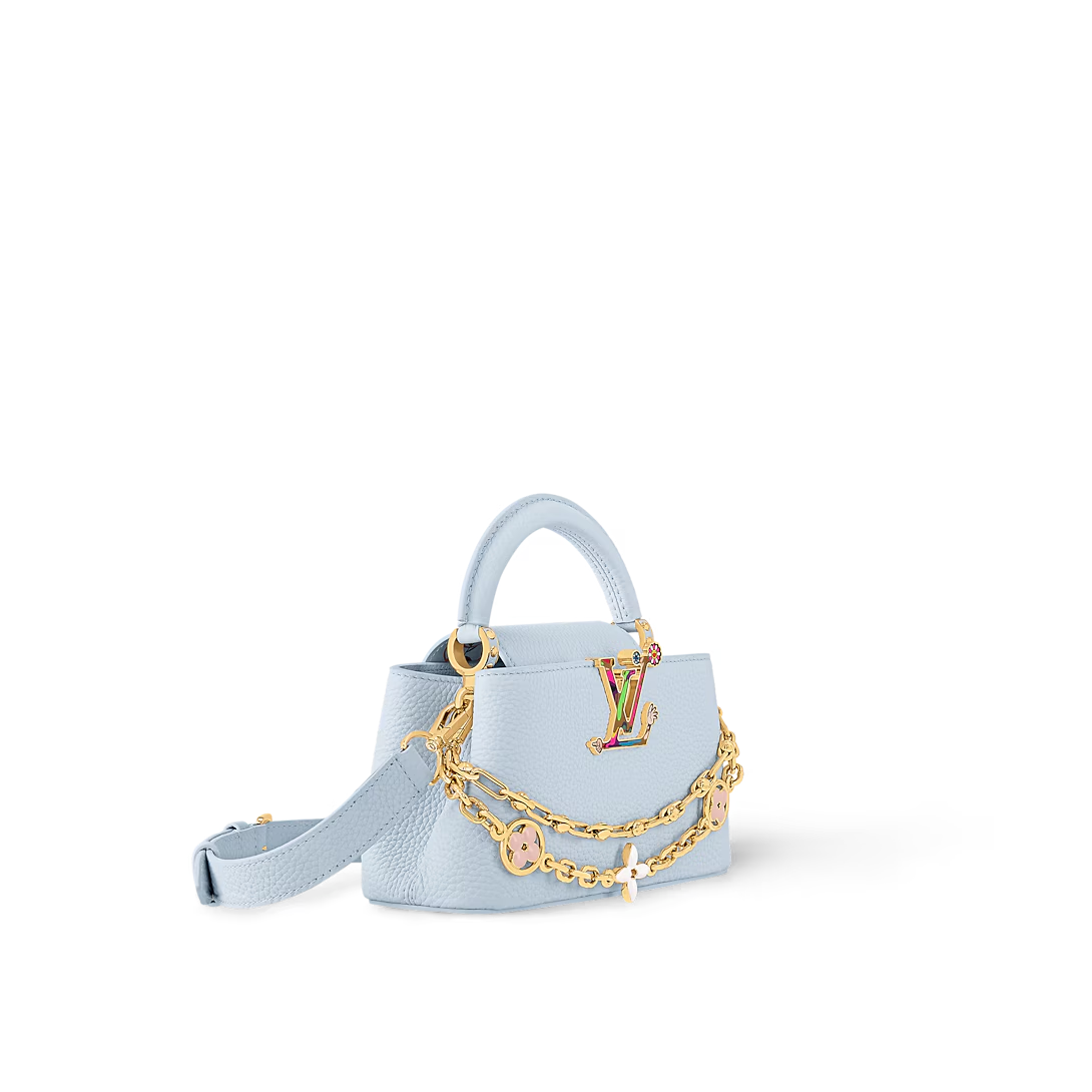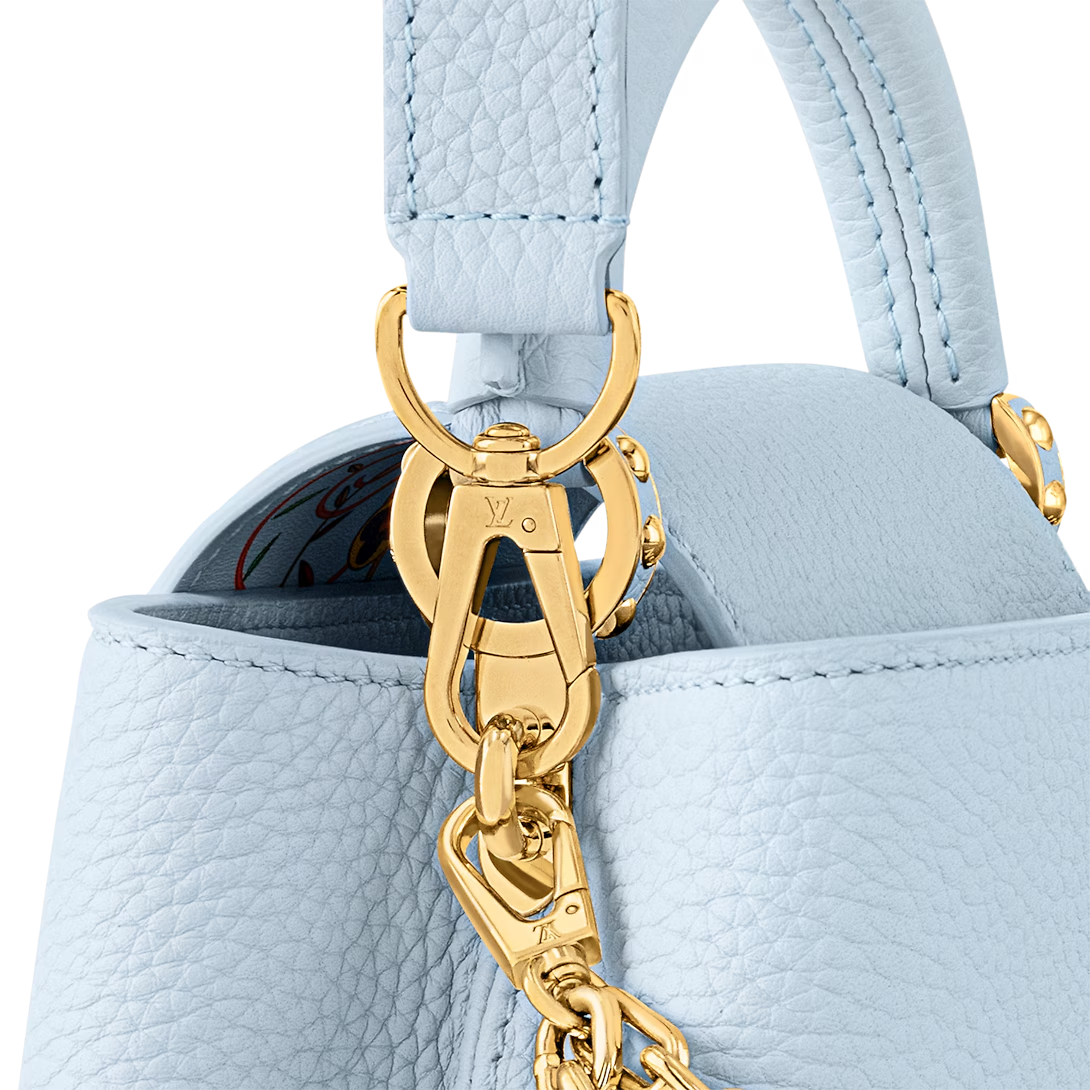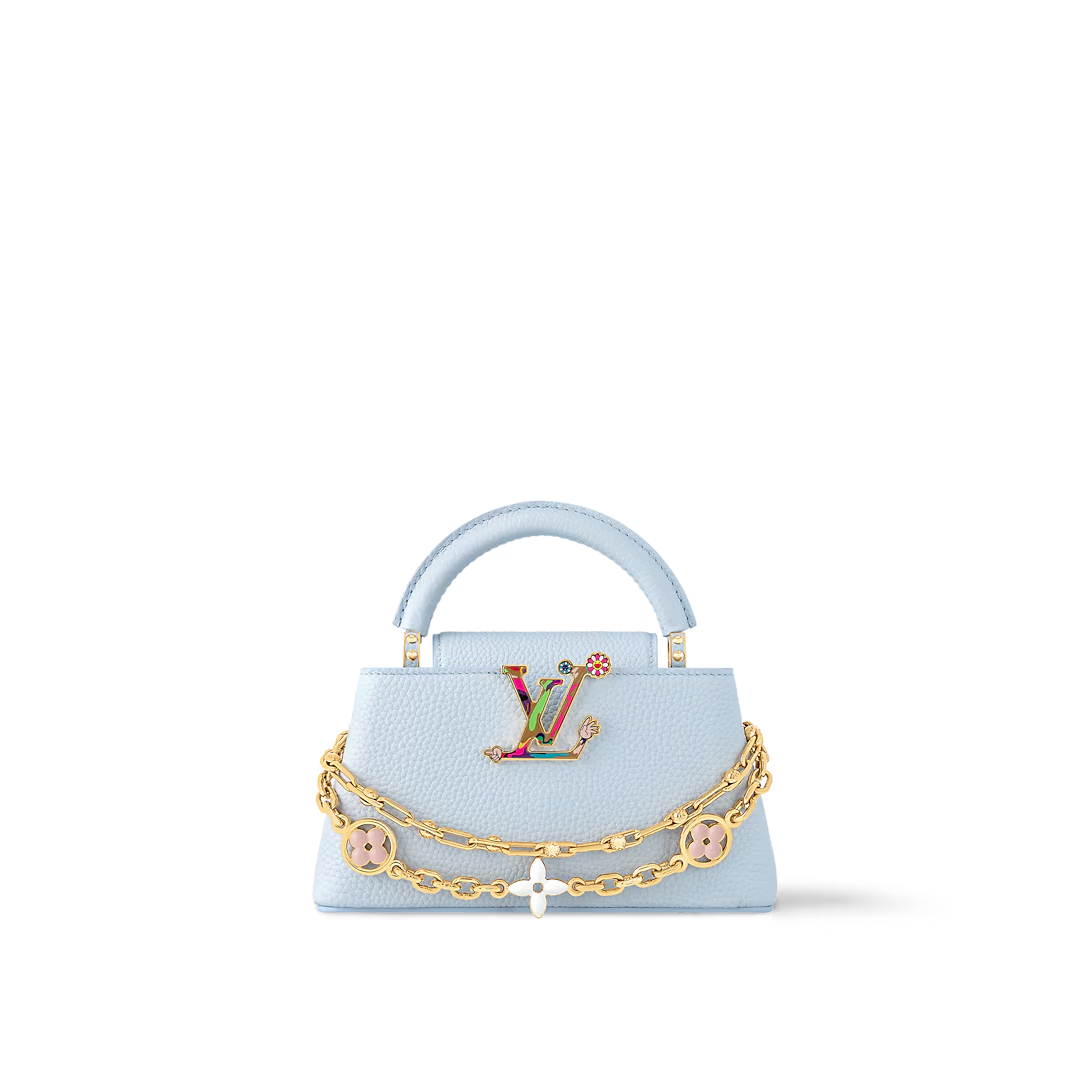Joyful codes from the re-edition of the Louis Vuitton x Murakami elevate the Capucines East-West handbag into a spirited statement. Takashi Murakami’s vernacular rainbow palette informs the soft blue shade of the Taurillon leather, while the emblematic LV Initials on the front and Monogram Flower accents on the chain are playfully reimagined in the artist’s signature superflat style.