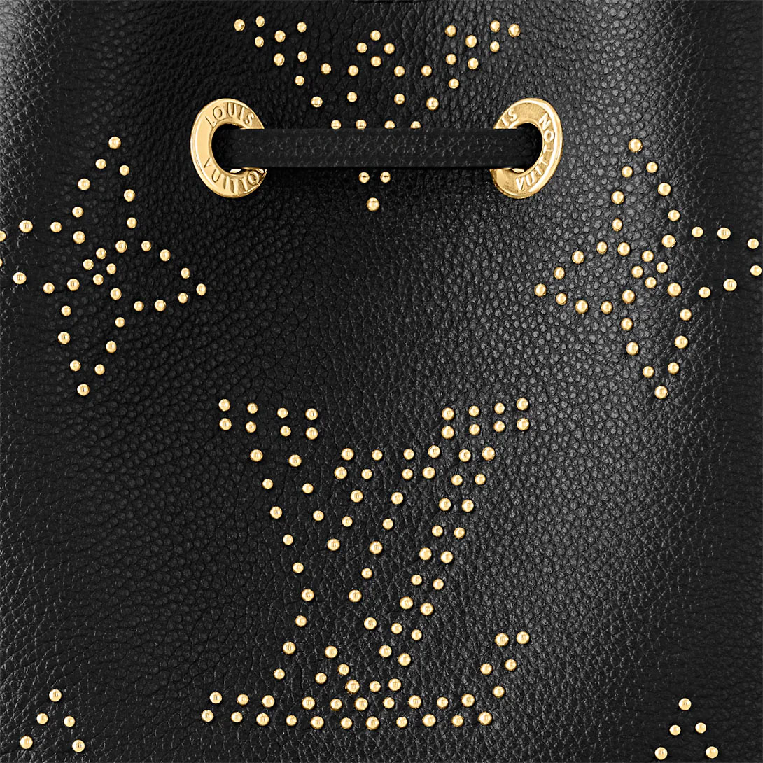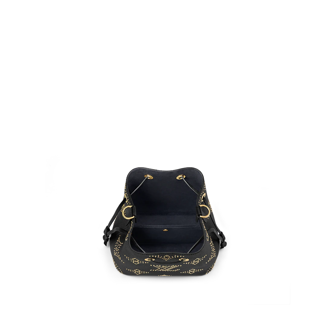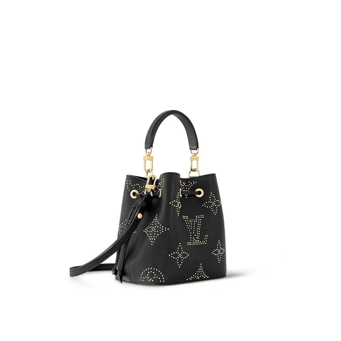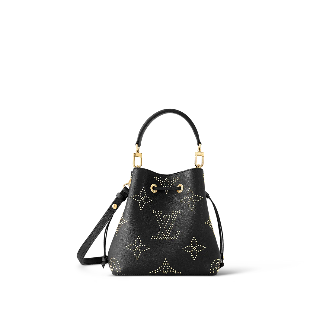 The NéoNoé BB bucket bag features an edgy version of the Monogram pattern formed with studs, each coated with 0.25 microns of gold. This compact bag is just the right size for belongings like a phone, keys, and a wallet. There’s a detachable top handle for hand and elbow carry as well as a removable shoulder strap.