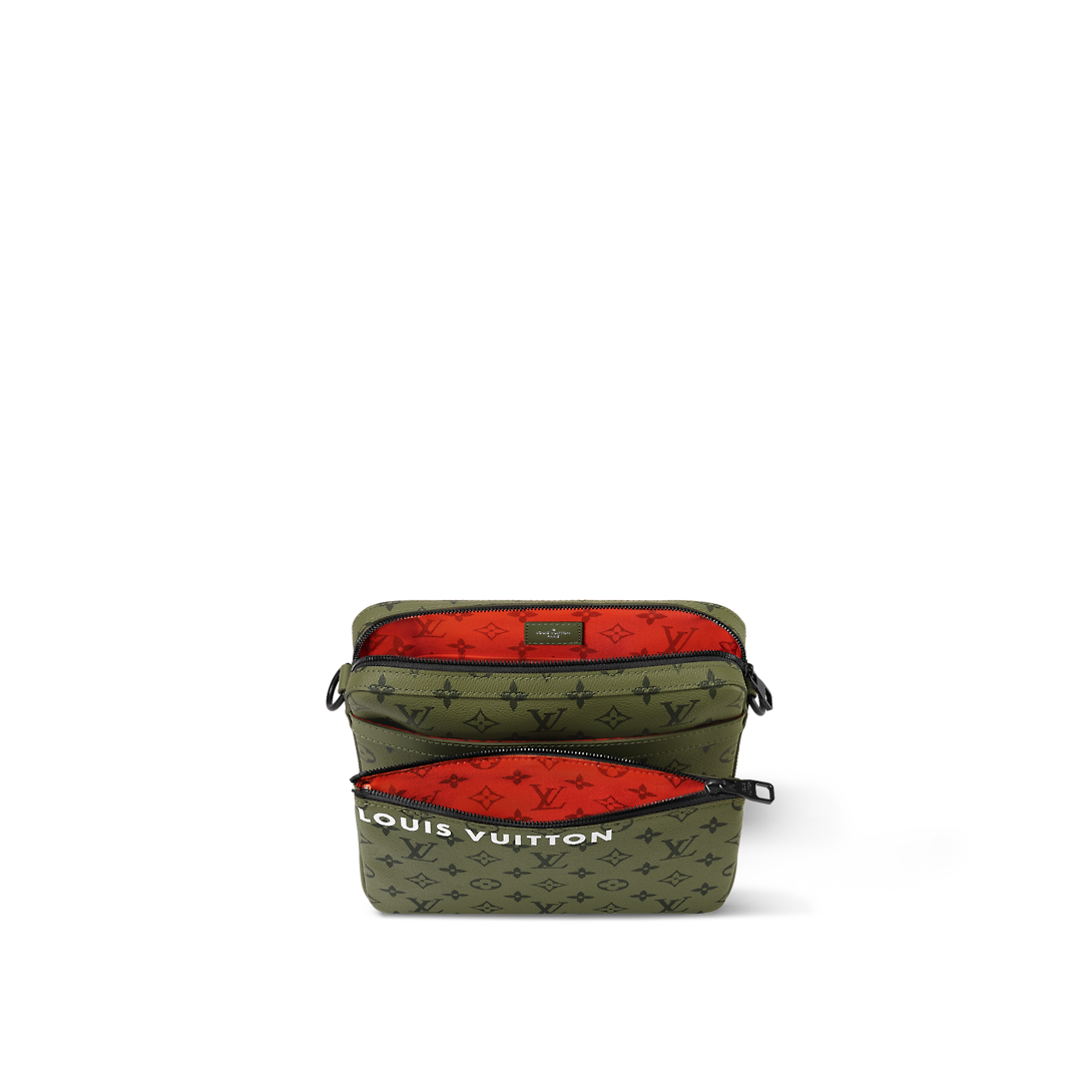 Three accessories in one, the Trio Messenger bag is composed of a removable coin purse, a main compartment, and a detachable front zipped pocket that can be removed and used separately. Crafted from green and red Monogram coated canvas, it comes with a detachable and adjustable textile strap to which the coin purse is attached.
